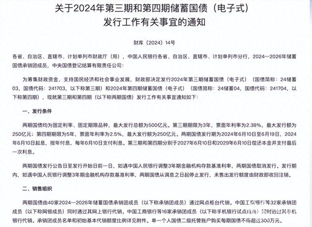 6月10号,2024年第三期和第四期储蓄国债(电子式)在银行渠道正式开售。据了解,此次售卖十分火爆,多个银行手机APP显示,可销售额度在开售后几分钟内就被抢购一空。