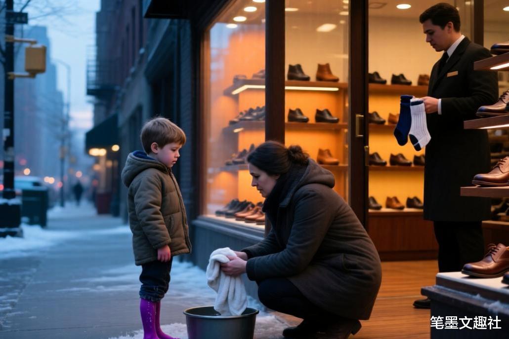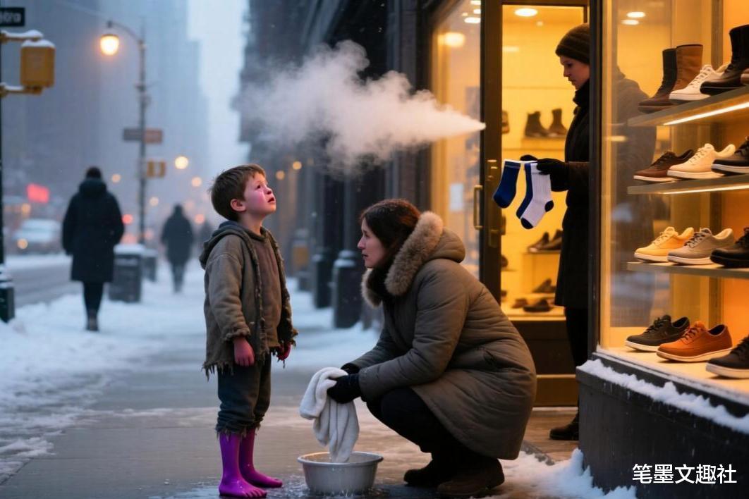 女士没有多问,只是温柔地牵起他冰凉的小手,带着他走进了温暖的鞋店。她没有立刻给他买鞋,而是先嘱咐店员拿来半打袜子,又轻声请求店员准备一盆热水和一条毛巾。店员欣然应允,很快便将热水和毛巾送到跟前。女士脱下自己的手套,不顾地面的寒凉,缓缓跪下,小心翼翼地将小男孩冻得僵硬的脚放进温热的水里,轻轻揉搓,动作温柔得像是在呵护一件稀世珍宝,再用柔软的毛巾一点点擦干,褪去所有的冰冷与狼狈。