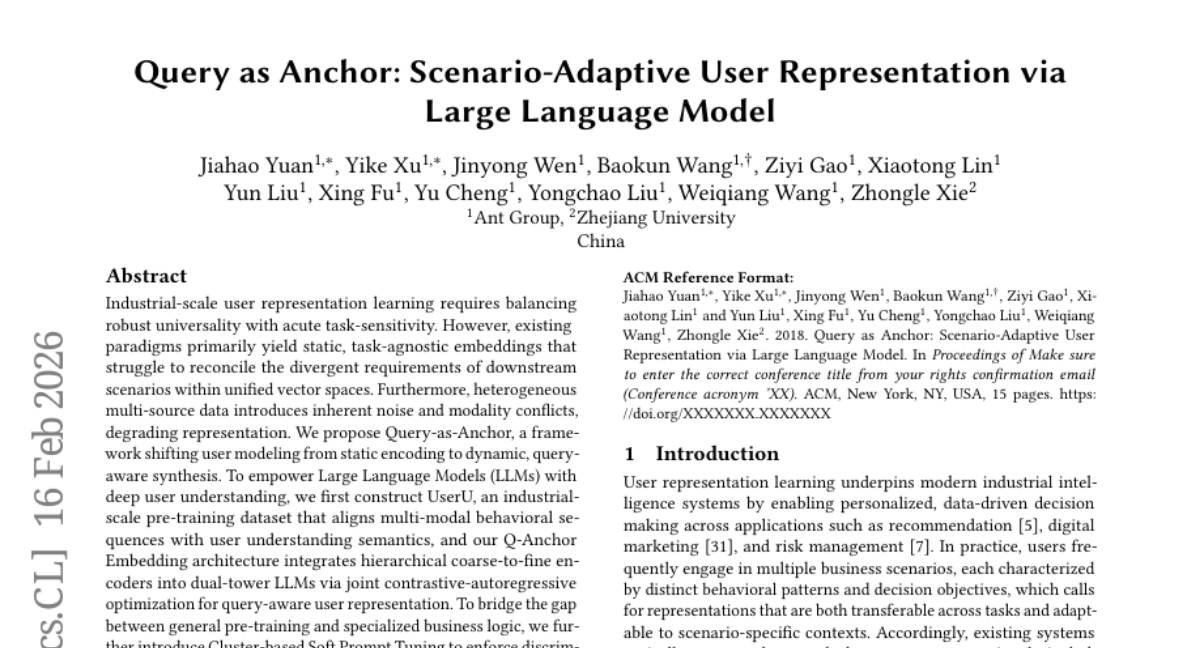A:Query-as-Anchor解决了传统用户画像"一刀切"的问题。传统方法为每个用户生成固定的表示,无法根据不同业务场景调整。而这个框架能根据具体查询(如风险评估或商品推荐)动态生成针对性的用户表示,就像一个智能变色龙,在不同场景下展现不同特征。