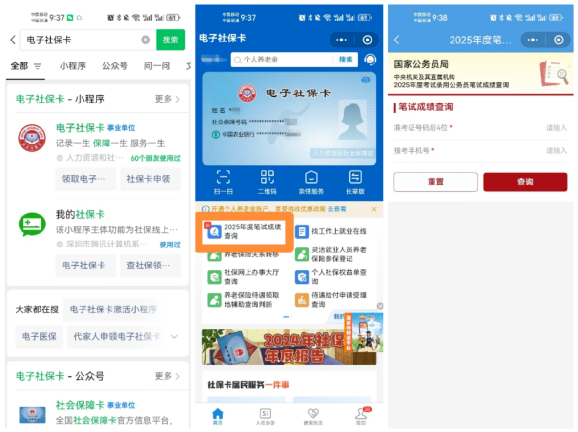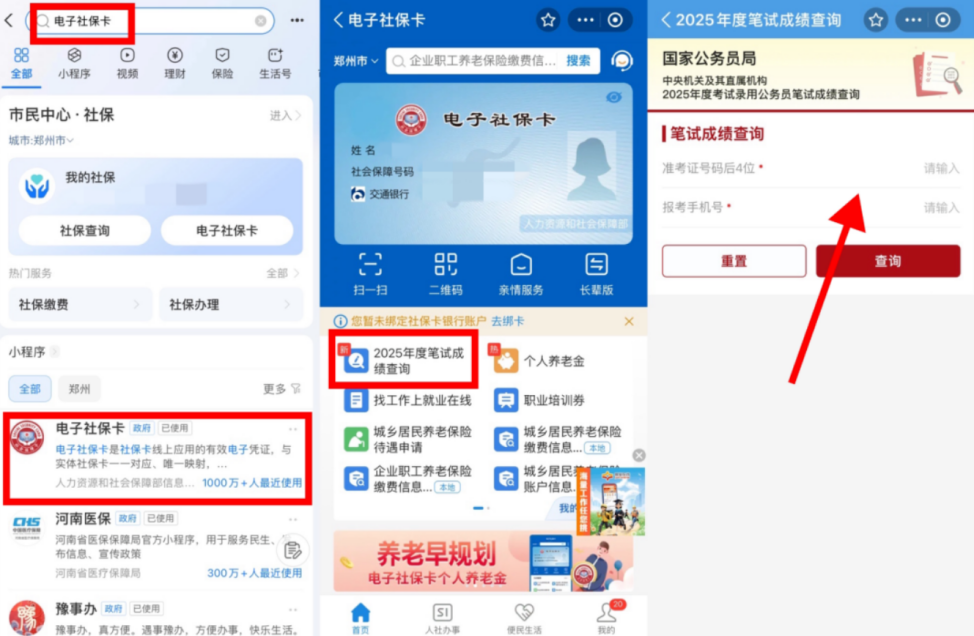 搜索“电子社保卡”-点击“2026年度笔试成绩查询”-输入账号密码登录查询