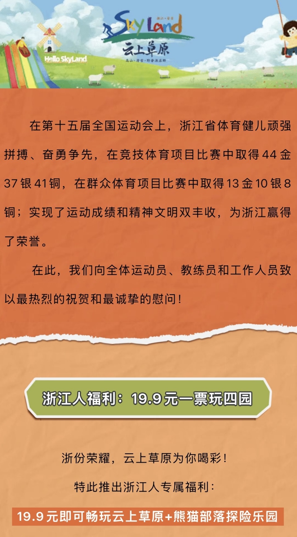 全运会创历史!浙江健儿运动成绩和精神文明双丰收。云上草原为你们喝彩!19.9元一票玩四园,包含索道