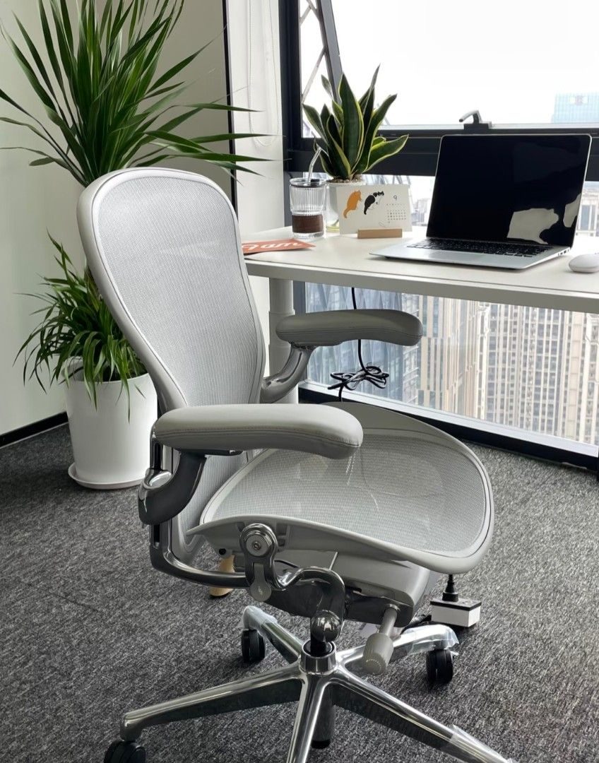 支撑度:Aeron采用8Z Pellicle网布悬架结构,提供不同区域张力,腰托PostureFit SL可独立调节,腰部和骶骨得到精准支撑。坐下后身体重量分散均匀,不会出现局部压力集中,即便长时间办公或后仰,腰椎和背部都能保持舒适承托。