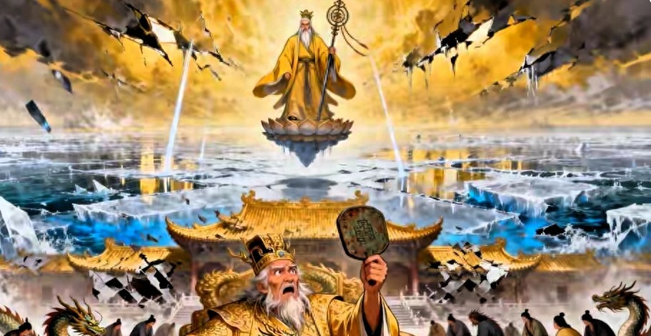 元始天尊立于龙宫大殿上空,声如洪钟,带着圣人独有的威严与怒意,震得龙宫梁柱嗡嗡颤动: