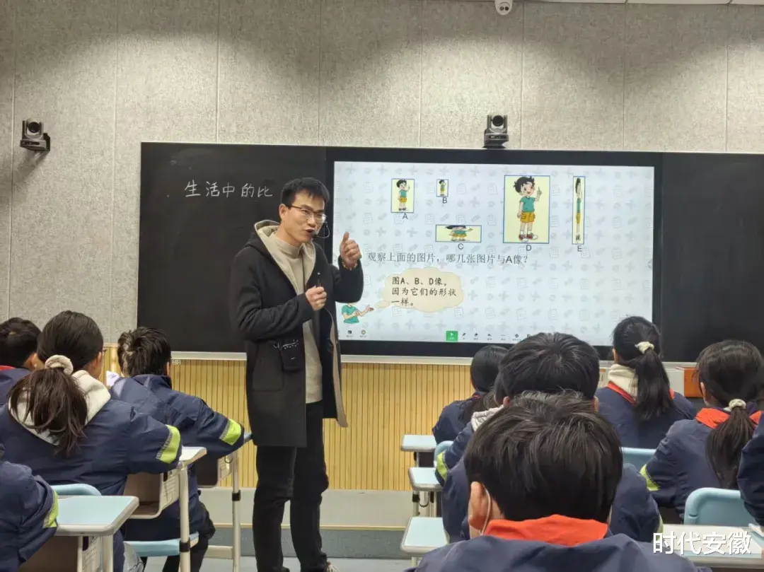 课堂伊始,魏老师通过“观察哪张图片与图A更像”的任务,引导学生探究长方形长与宽的关系,学生在“数长和宽、算比值、议规律”的小组活动中发现:当长与宽的比值相等时,图形更相似,由此自然引出“比是两个数相除”的概念,并结合“6:4读作六比四”“求比值就是求商”等实例,让学生掌握比的读法、写法及计算方法。