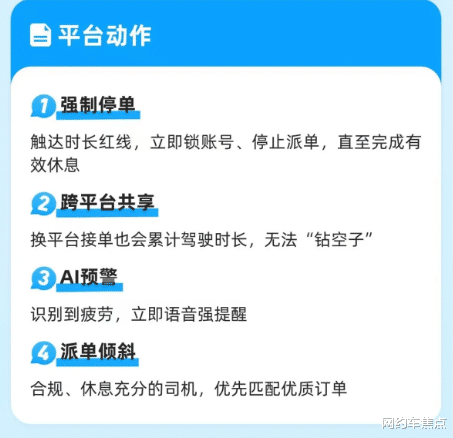不同平台之间的驾驶时长数据将实现共享,换平台接单也会累计时长,之前车主会在哈罗接完单后,用一喂或者滴滴接单,但是现在,监管的是车,就算跨平台,驾驶时长也会累计,没法钻空子。