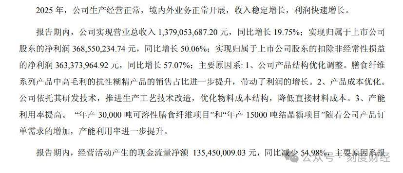 亮眼业绩背后,是公司膳食纤维、益生元、健康甜味剂三大核心产品矩阵的协同发力,以及境外市场的爆发式增长。2025年公司境外收入达9.23亿元,同比增长32.28%,首次超越境内市场成为第一大收入来源,产品远销全球六十多个国家和地区。