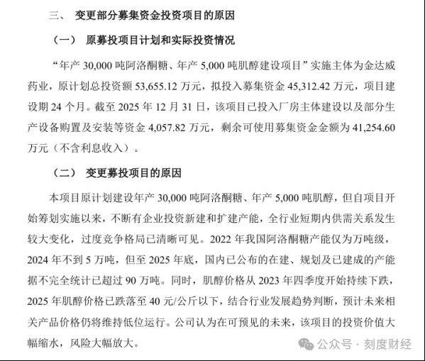 今年1月9日,金达威在《关于变更部分募集资金投资项目的公告》中宣布取消原计划投资超4.5亿元的“年产30000吨阿洛酮糖及5000吨肌醇建设项目”,公告指自筹划项目以来,全行业短期内供需关系发生较大变化,过度竞争格局已清晰可见,2022年我国阿洛酮糖产能仅为万吨级,2024年不到5万吨,但至2025年底,国内已公布的在建、规划及已建成的产能据不完全统计已超过90万吨。