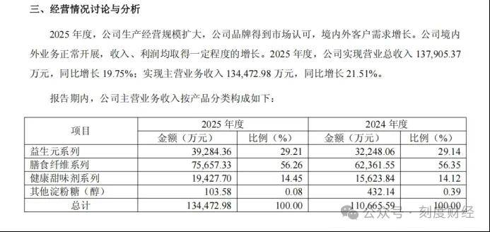 从主营业务构成来看,膳食纤维系列依旧是公司第一大收入来源,2025年实现营收7.57亿元,占主营业务收入比重达56.26%,同比增长21.32%,其中高毛利的抗性糊精产品销售占比进一步提升,成为拉动利润增长的关键。益生元系列实现营收3.93亿元,占比29.21%,同比增长21.82%,健康甜味剂系列实现营收1.94亿元,占比14.45%,同比增长24.35%,保持了较快的增长速度。