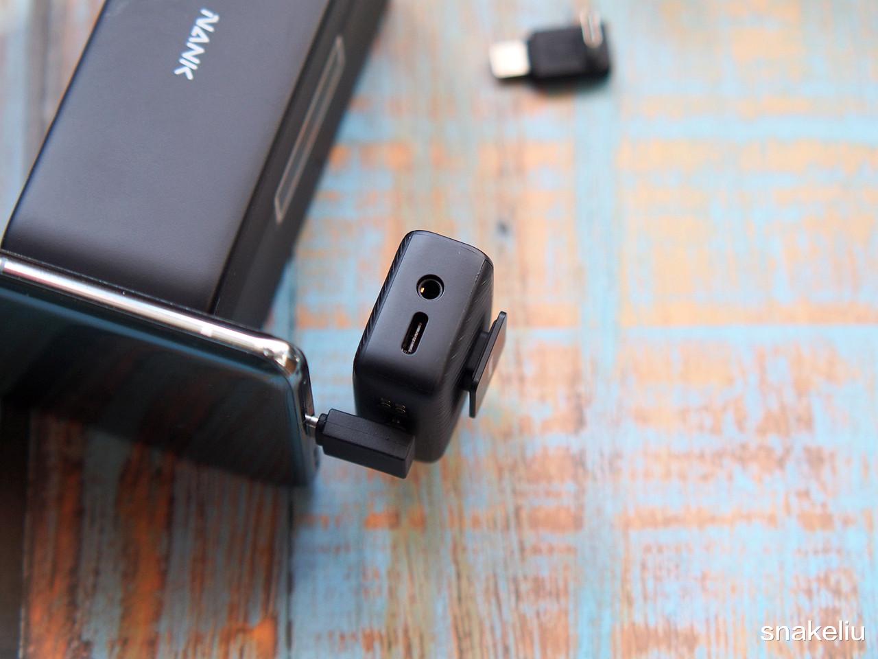 Qmic这款领夹式麦克风,接收器两侧是开关和3.5mm接口Type-C口。这个3.5mm接口可以方便的连接各类相机,为此接收器底部还设计了一个热靴卡槽,可以方便的卡在相机顶部的热靴上。Type-C口可以连接附送的C口耳机用于监听录音内容,当然你也可以使用自己的C口耳机来做监听。