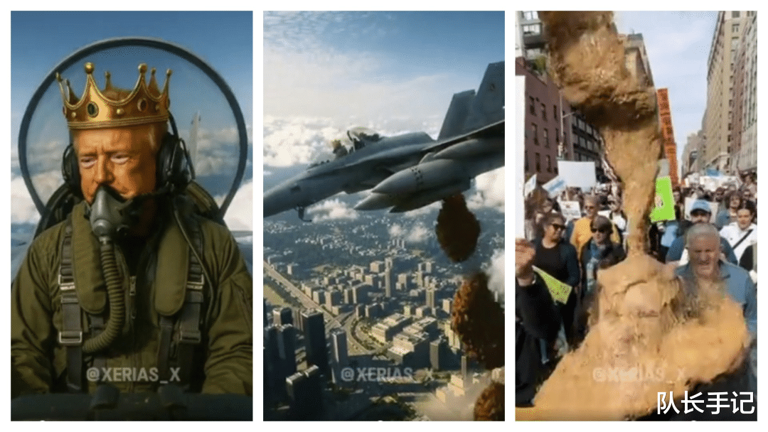 面对700万人的怒吼,特朗普如何回应?他没有发表演讲,没有召开记者会,而是发布了一段AI生成的视频:画面中,他头戴王冠,身穿飞行员服,驾驶战机,向街头抗议人群“泼洒泥浆”,配文:“他们抗议?我泼他们一身脏!”
