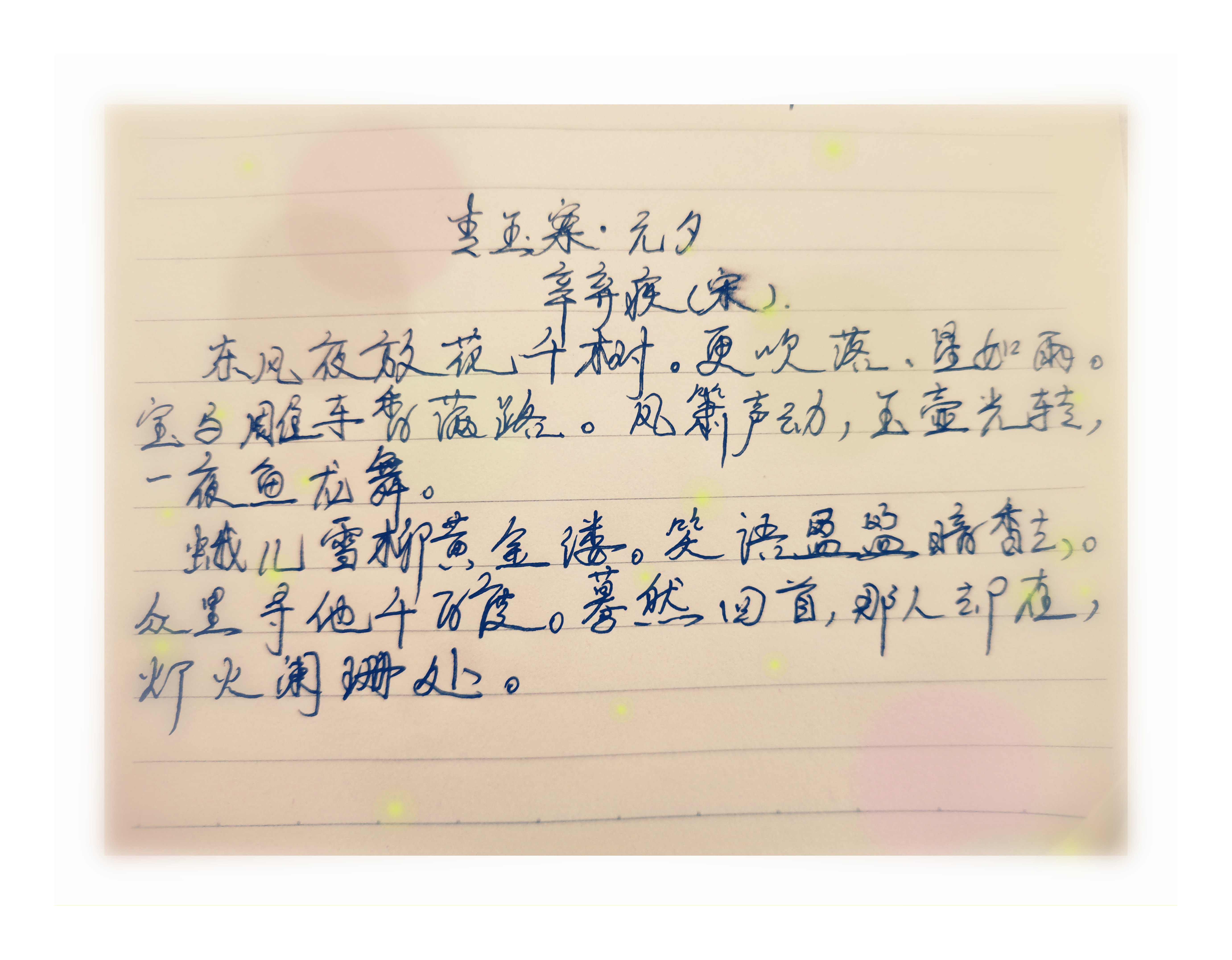 《青玉案·元夕》是宋代词人辛弃疾创作的一首词。此词从极力渲染元宵节绚丽多彩的热闹场面入手,反衬出一个孤高淡泊、超群拔俗、不同于金翠脂粉的女性形象,寄托着作者政治失意后不愿与世俗同流合污的孤高品格。全词采用对比手法,上阕极写花灯耀眼、乐声盈耳的元夕盛况,下阕着意描写主人公在好女如云之中寻觅一位立于灯火零落处的孤高女子,构思精妙,语言精致,含蓄婉转,余味无穷。