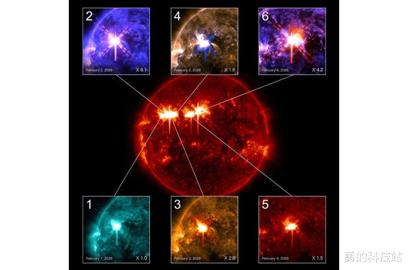 2026年2月1日至4日,共爆发了六次太阳耀斑。图片来源:NASA