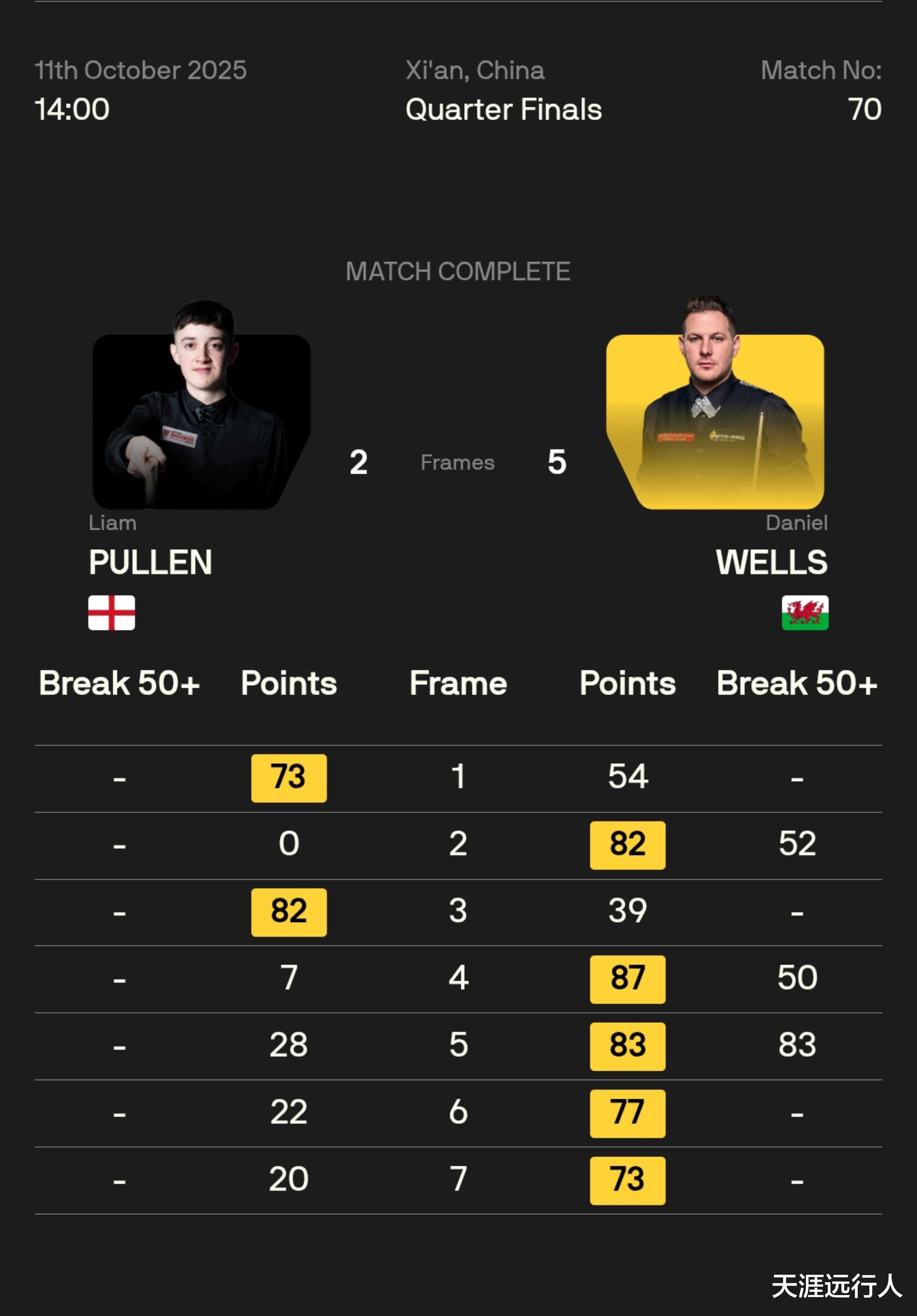 两人的遭遇战,丹尼尔·威尔斯打出单杆52、50、83分,前三局1-2落后于利亚姆·普伦,接下来一波四连鞭,连胜四局,完成绝地大逆转,以5-2战胜普伦,率先晋级四强,这也是威尔斯连续两年晋级西安大奖赛四强。