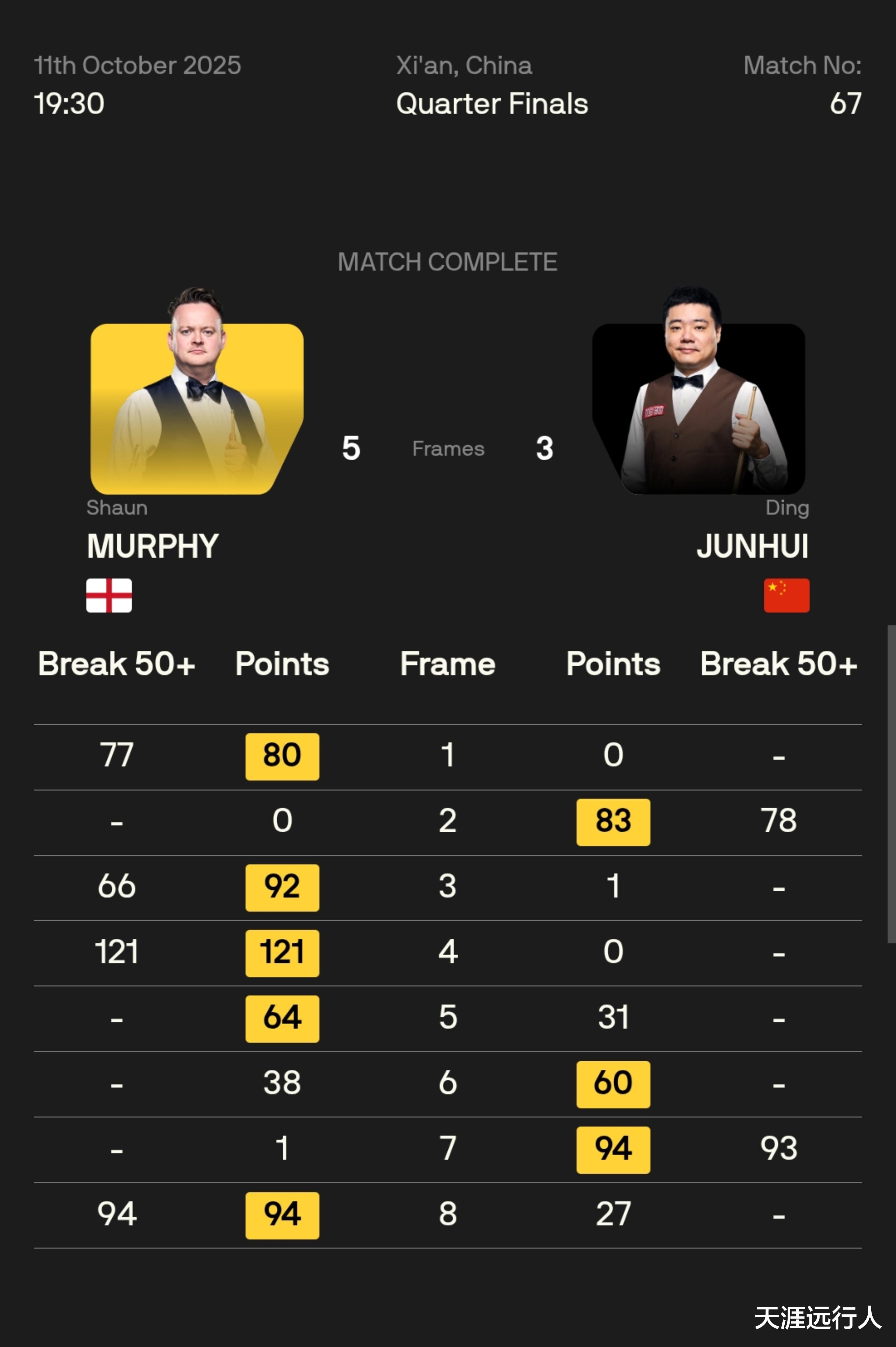局休回来,墨菲64-31先达赛点;接下来,丁俊晖凭借防守和一杆单杆93连扳两城,比分来到3-4;