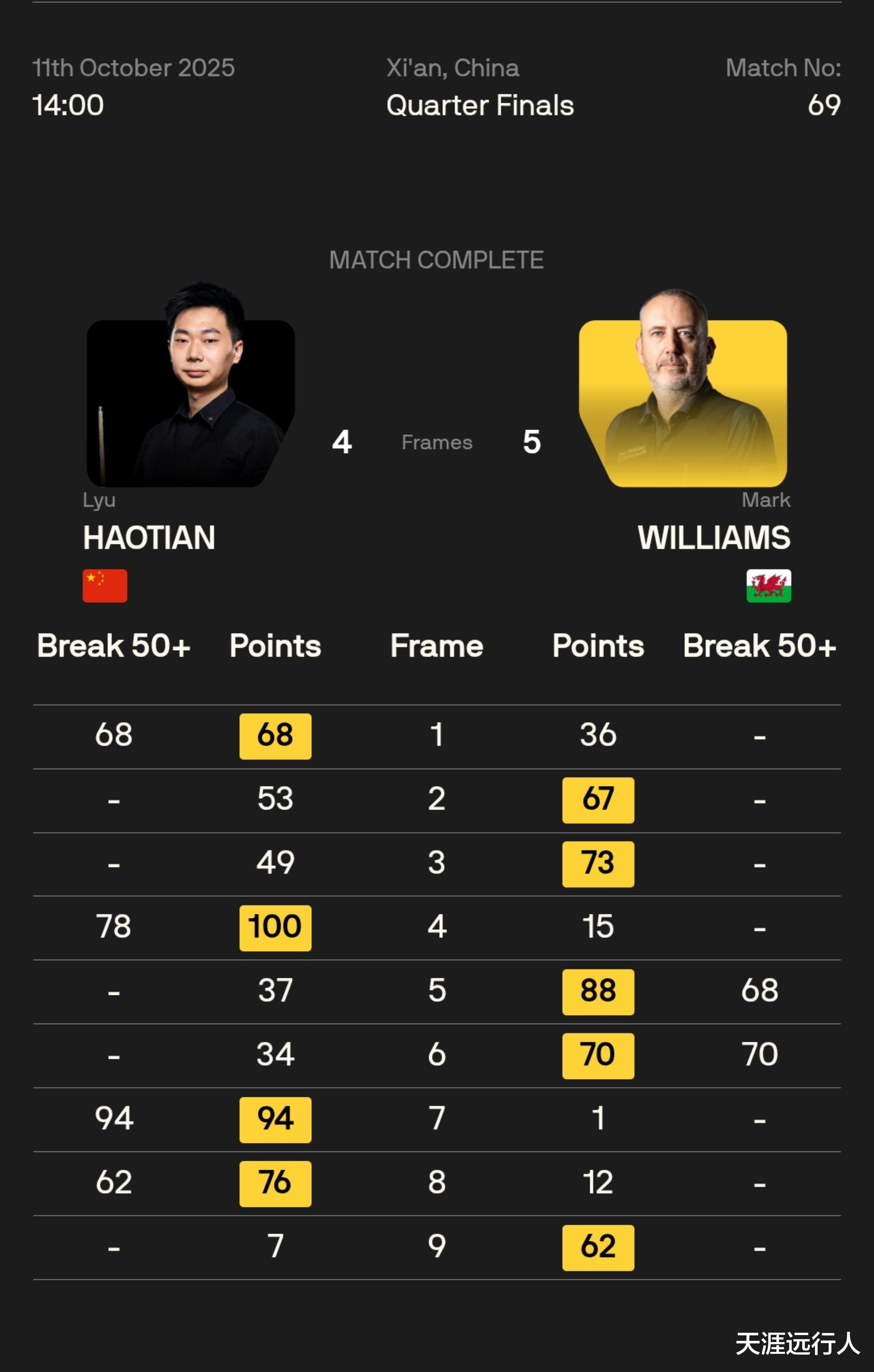双方此前曾有过五次交手,马威四胜一负,不过最近一次也是四年前了,本场比赛,马克·威廉姆斯打出68、70分两杆单杆50+,吕昊天打出68、78、94、62分四杆50+,小吕先后1-2、2-4落后,奋力抹平赛点,双方战至决胜局,威廉姆斯62-7完成超分,以5-4战胜吕昊天,晋级四强,半决赛对阵丹尼尔·威尔斯。