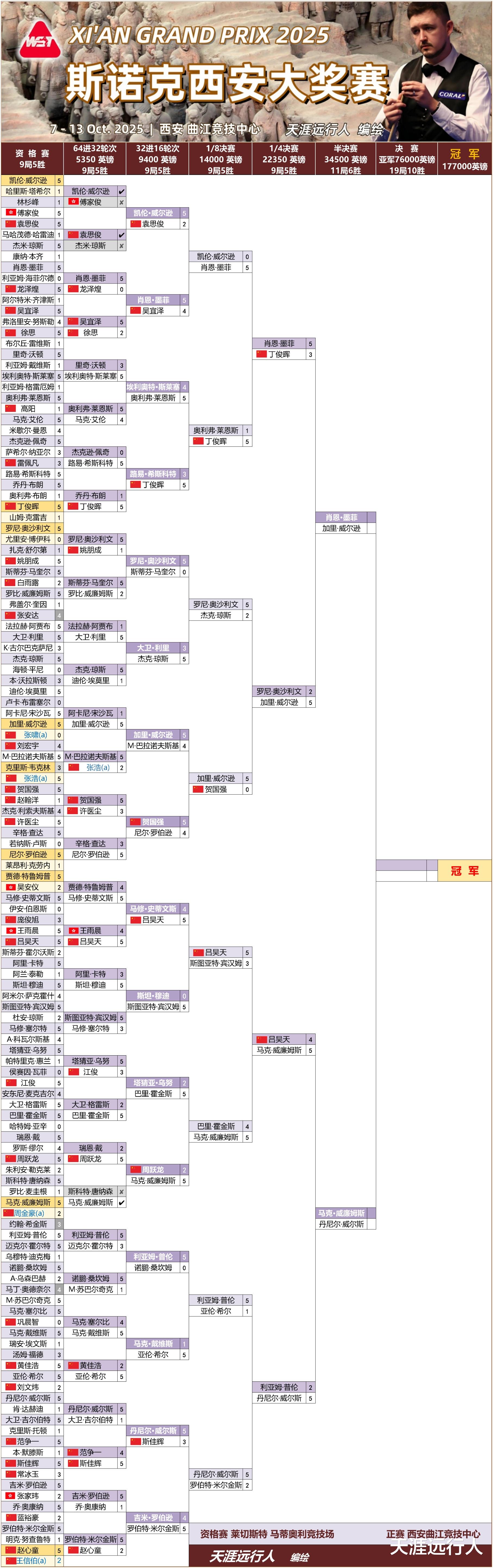 最新即时更新2025斯诺克西安大奖赛进程签表,一表看西安大奖赛全程