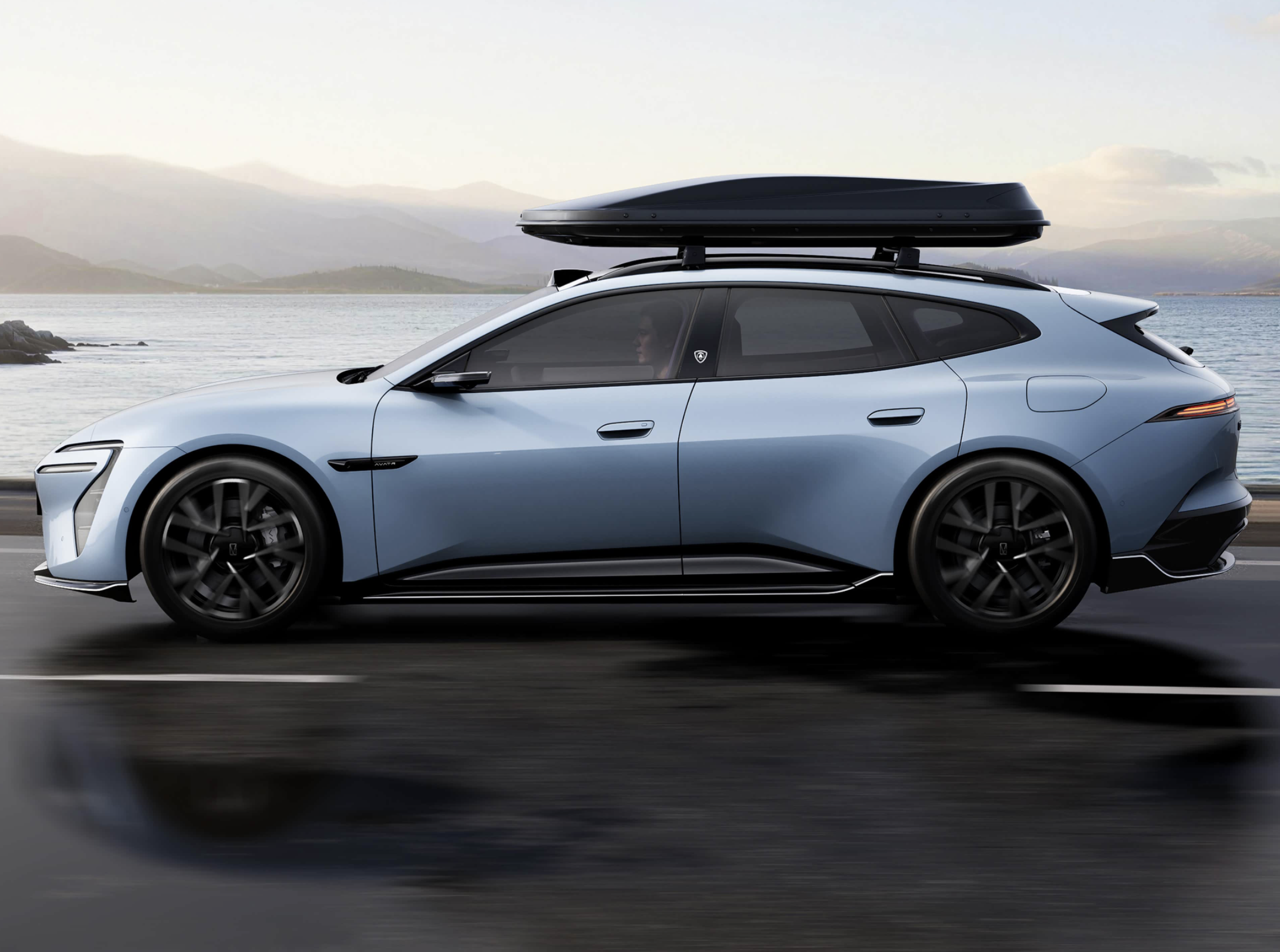 来到车身侧面,阿维塔06T采用了时下最优雅的旅行车轮廓设计,倾斜的A柱、弧线形的车顶以及略带溜背式的线条一气呵成,车顶配备了实用性更强的车顶外挂行李箱。车窗四周加入了黑色的装饰条,黑色的B柱和C柱与茶色的隐私玻璃相得益彰,车门采用了立体声的造型,笔直的腰线带来了不错的光影效果。四个隐藏式门把手搭配着无边框车门,配备20英寸与21英寸两种规格的轮圈可选,匹配的轮胎规格为235/45R20、255/45R20以及245/40R21,打造出性能旅行车的氛围感。细节方面,车头配备了激光雷达,前翼子板处加入了黑色的装饰徽标,还加入了黑色宽体碳纤维侧裙,并加入了时下最前沿的电子后视镜。