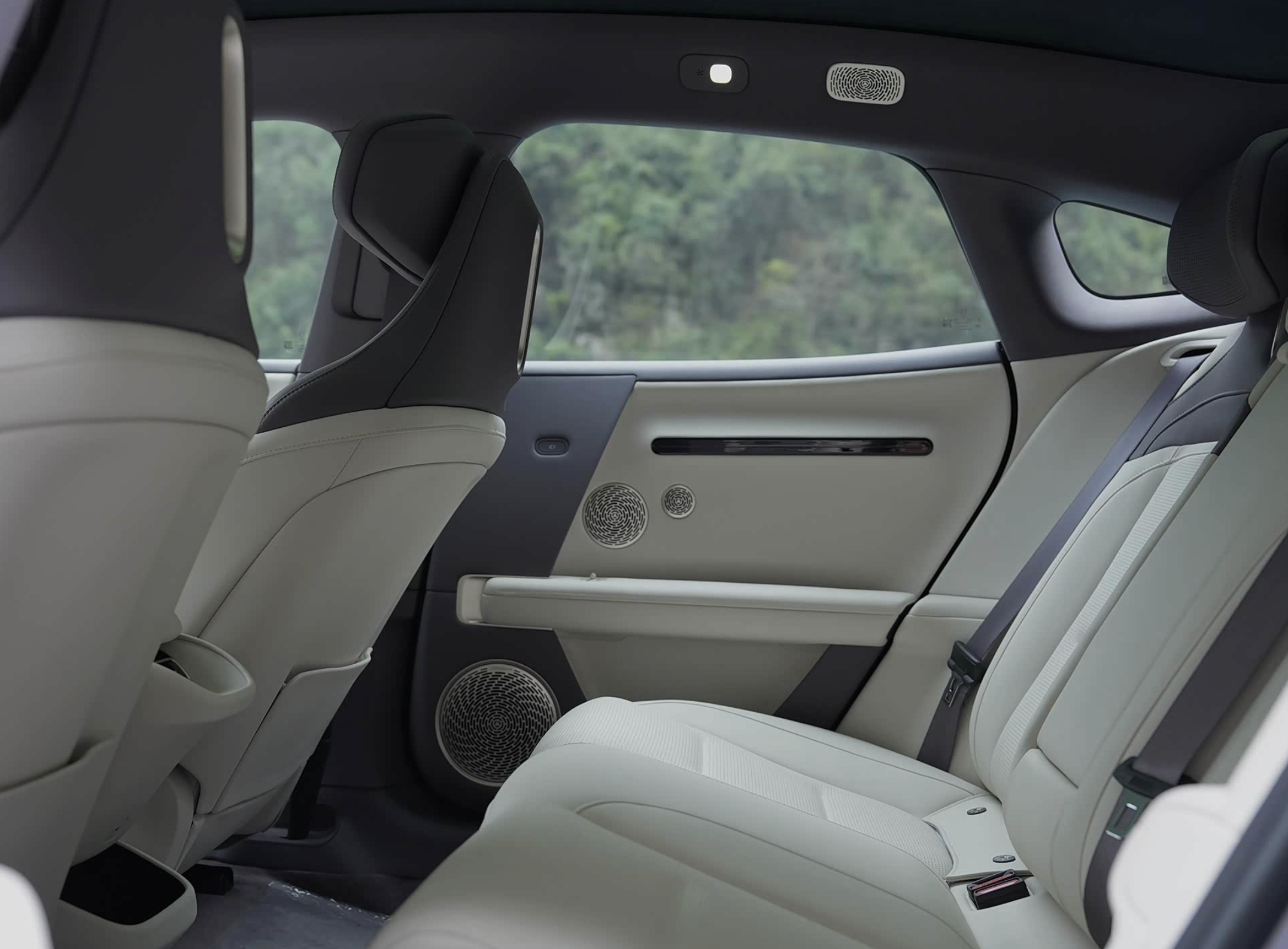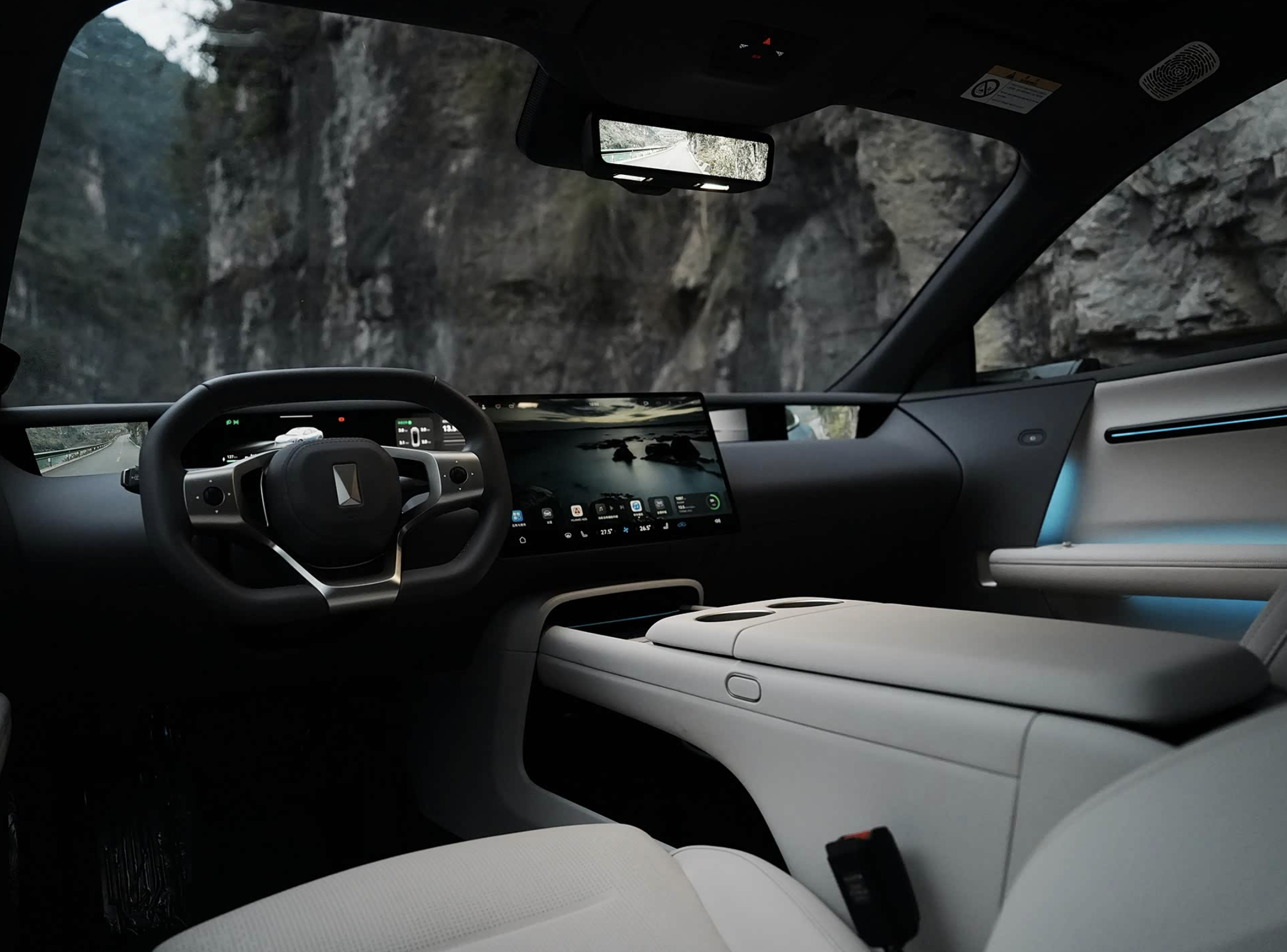 阿维塔06T的车内采用了更加科幻、前卫的设计布局,采用了大面积低饱和度的米白色高档软性材质铺陈,还加入了浅灰色的皮革材质交替铺陈,还加入了金属材质的扬声器装饰,杯架周围加入了银色金属圆环,就连最容易被忽略的车顶棚和地毯也都加入了植绒面料。360°环拥式座舱与Gentle Tech极简设计语言也更具视觉冲击力。中控台配备了35.4英寸全景宽屏、15.6英寸中控屏,两侧还能显示流媒体后视镜功能,中间部分用来显示驾驶相关信息。搭载的华为鸿蒙HarmonyOS 5车机系统和华为高阶智能驾驶解决方案2.0,还有华为乾崑智驾ADS 3.0,支持高速/城区智驾领航、车位到车位领航辅助、泊车代驾等功能。