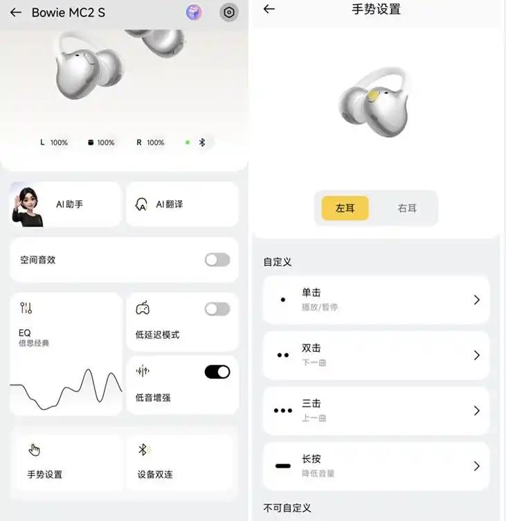 倍思MC2 S配备了专属的APP,里面的功能非常丰富,集成了AI助手、AI翻译、空间音效、EQ调节、低延迟模式、低音增强以及手势设置和设备双连等实用选项,用户可以根据自己的使用习惯和场景需求进行个性化设定。