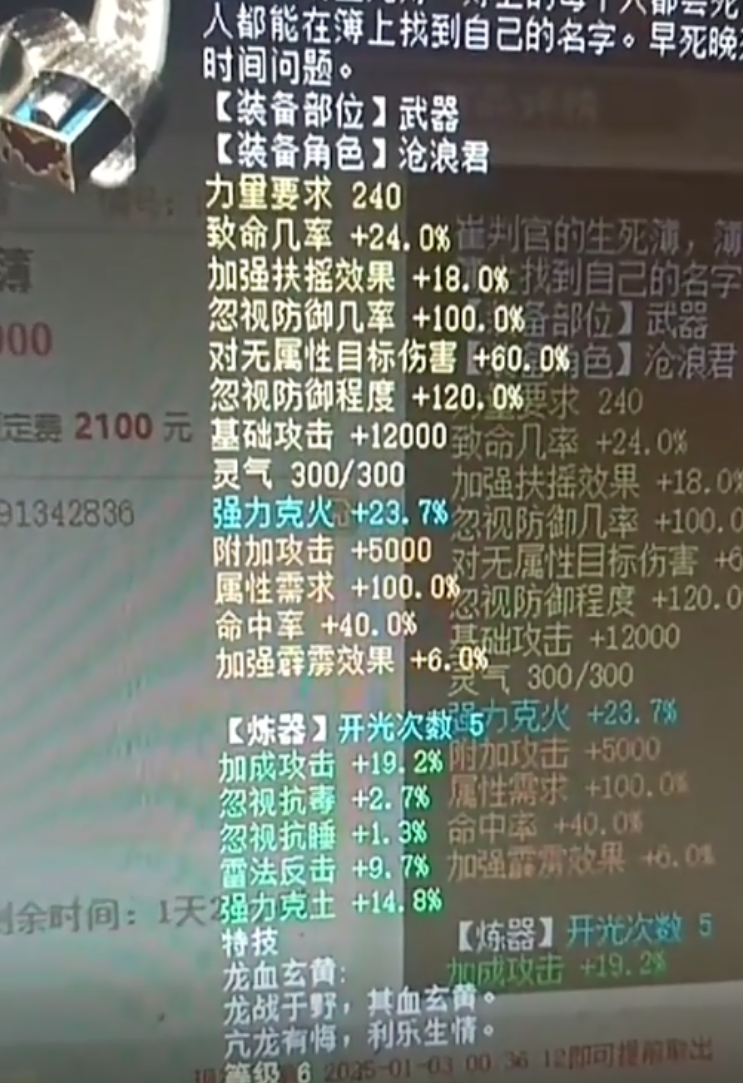 价值42000元的龙族扶摇破6级神兵!蓝字是强力克火23.7,炼器是加成攻击19.2,可惜强力克土不值钱,大家觉得这位老哥的6级破能卖这个价钱吗?