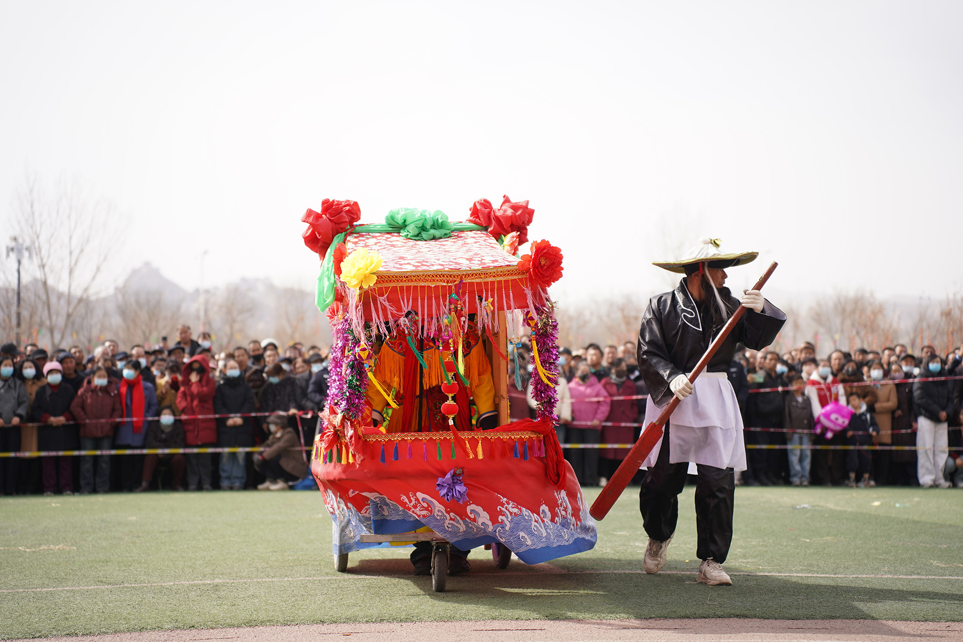 灵动轻盈的旱船在“艄公”的引领下,似在水中漂游,摇曳生姿;金色的长龙在舞龙者手中上下翻飞,左右盘旋,仿佛真的要腾云驾雾而去;精巧的滚灯随着演员的身姿流转滚动,光影变幻,煞是好看;还有那充满野趣的“老虎熊”表演,模仿兽态,憨态可掬又威风凛凛,展现着人们对自然力量的朴素认知与敬畏。