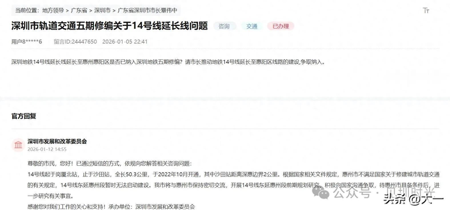 2026年1月12日,针对市民提出的“深圳地铁14号线延长至惠州惠阳区是否已纳入五期修编”的咨询,深圳市发改委通过短信方式正式回复:
