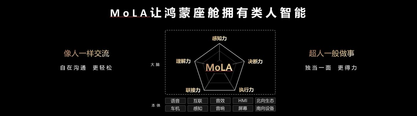 2025年11月举办的华为乾崑生态大会上,华为宣布,鸿蒙座舱将支持MoLA混合大模型,可实现类人智能,进而迈入L3专业助理阶段,不光可通过图文视频混合形式解答用车疑问,还能联动外部工具完成咖啡预订等跨场景任务。