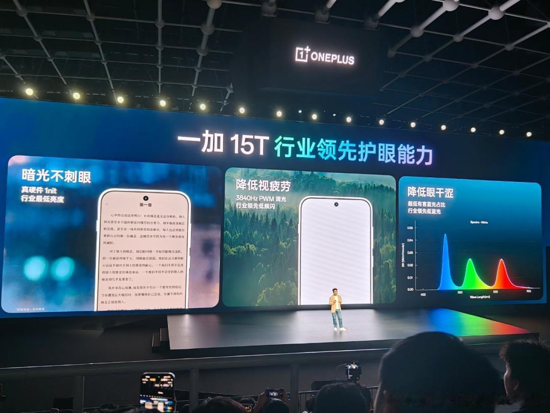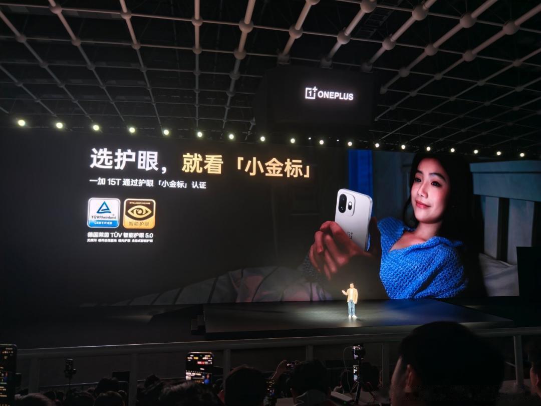 顶级的显示素质之外,一加 15T 还搭载医显共研的全新「明眸护眼」技术,凭借硬件级低蓝光、至低 0.04 SVM 的行业领先低频闪以及 AI 距离提示、晕动舒缓、节律舒眠等七大 AI 主动护眼功能,成功斩获小屏领域唯一的护眼「小金标」认证,成为小屏护眼新标杆,无论长时间游戏或阅读浏览,眼睛也能保持舒适。