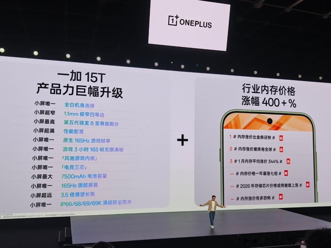 2026 年 3 月 24 日,一加全新小屏旗舰一加 15T 正式发布。作为一加数字旗舰系列的最新力作,一加 15T 在 6.32 英寸的精巧机身下,实现性能、游戏、续航、影像及系统等维度的全面跃升。一加 15T 搭载第五代骁龙 8 至尊版移动平台、自研电竞网络芯片 G2 以及灵犀触控芯片,配合独家自研新一代「风驰游戏内核」与冰河散热系统,实现行业唯一小屏手机 165 超高帧游戏体验。一加 15T 配备 7500mAh 超巨量冰川电池+100W 超级闪充+50W 无线闪充的豪华续航回血组合,随时随地快速补能。一加 15T 搭载 5000 万像素 3.5 倍潜望长焦镜头和 LUMO 凝光影像系统,拍人拍景都好看。一加 15T 还内置全新 ColorOS 16 系统,带来多项高效的 AI 功能与全新的游戏助手体验。此次一加 15T 带来「治愈白巧」、「松弛抹茶」和「纯粹可可」三款配色。