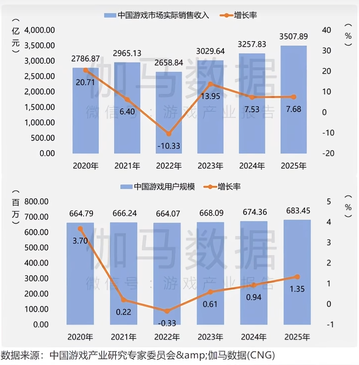 伽马数据的《2025年中国游戏产业报告》显示:2025年,国内游戏市场实际销售收入3507.89亿元,用户规模6.83亿,同为历史新高点。