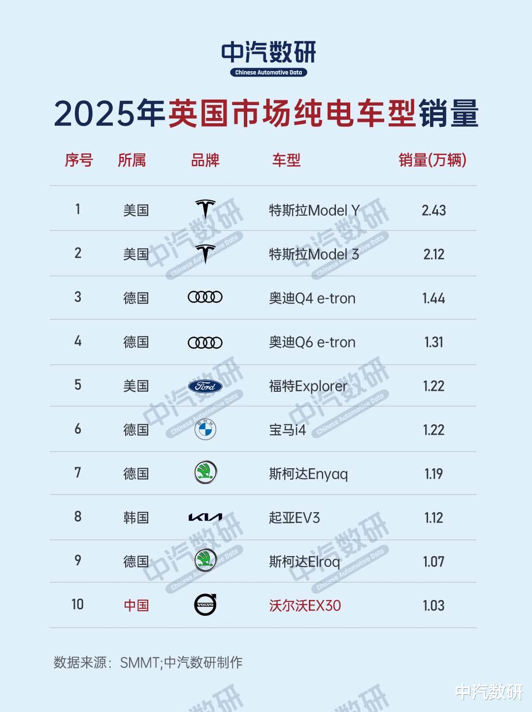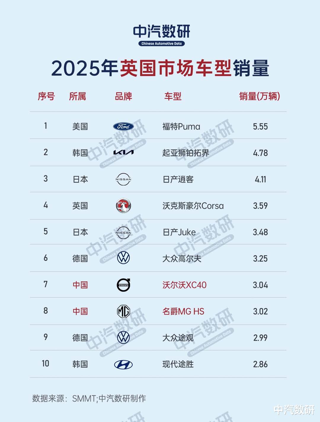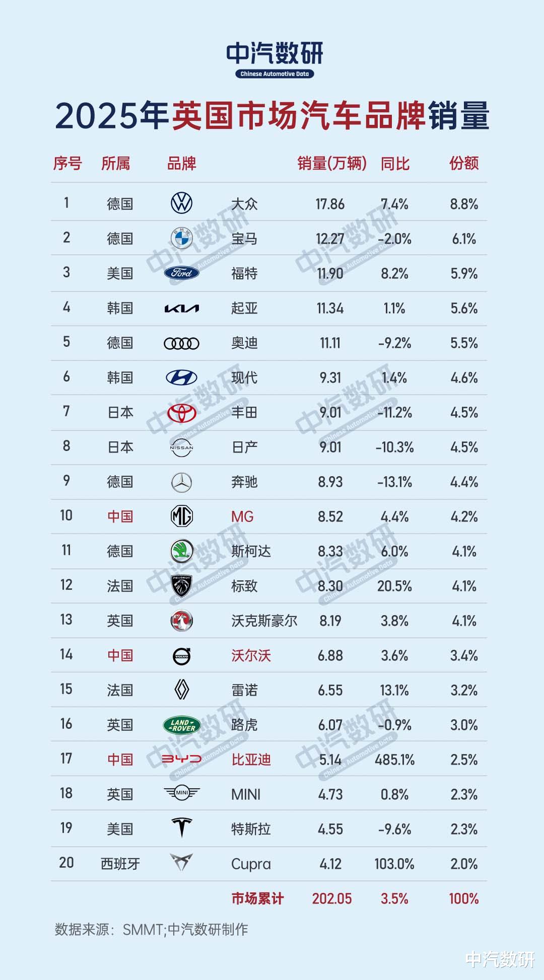 英国汽车制造商和贸易商协会(SMMT)数据显示,2025全年英国乘用车销量202.05万辆,同比增长3.57%,为新冠疫情后首次超过200万辆。从公开统计的品牌、车型及纯电细分市场表现看,传统品牌仍占据头部位置,但中国品牌的“多点突破”已成为市场格局的核心变量。