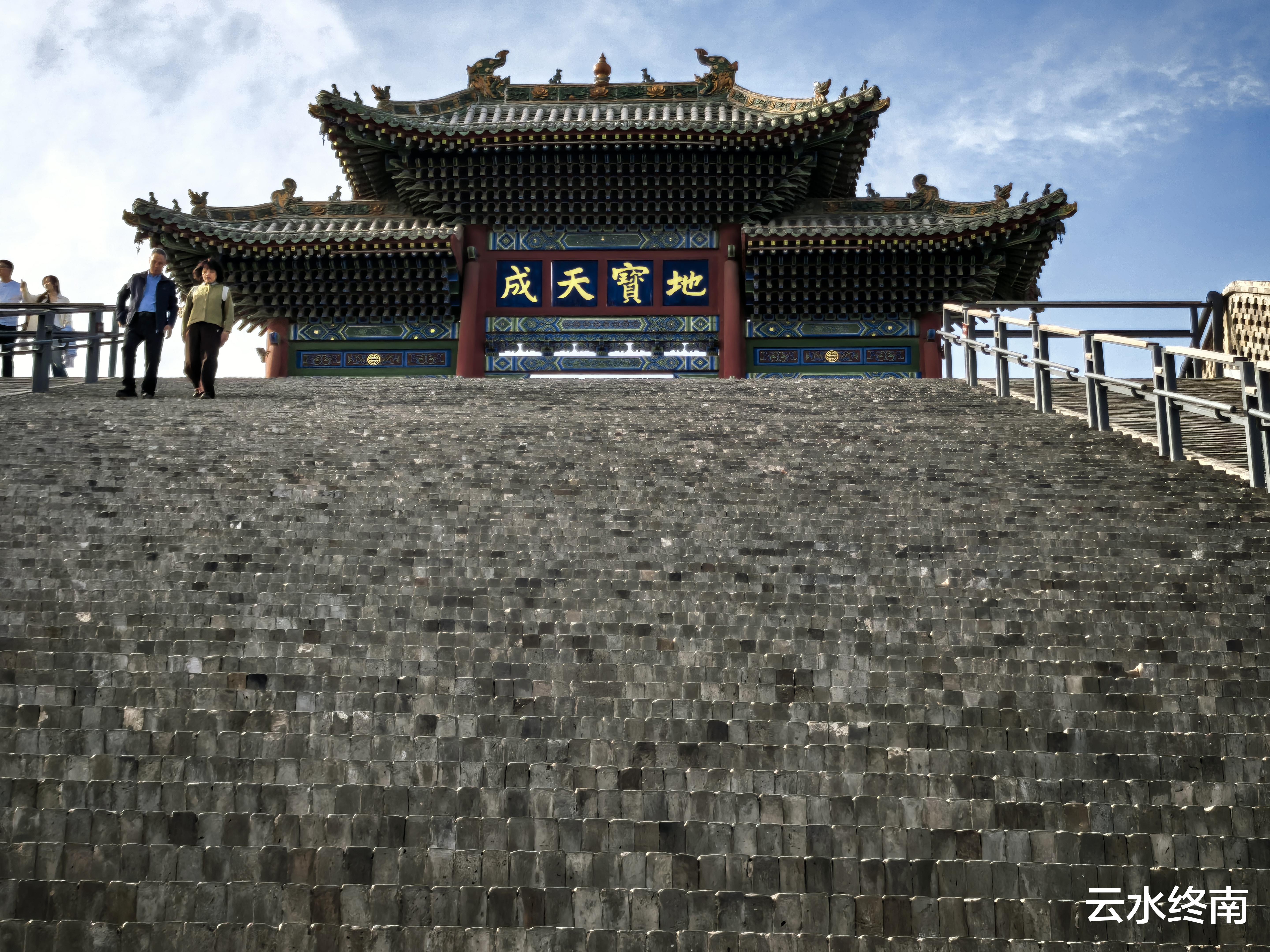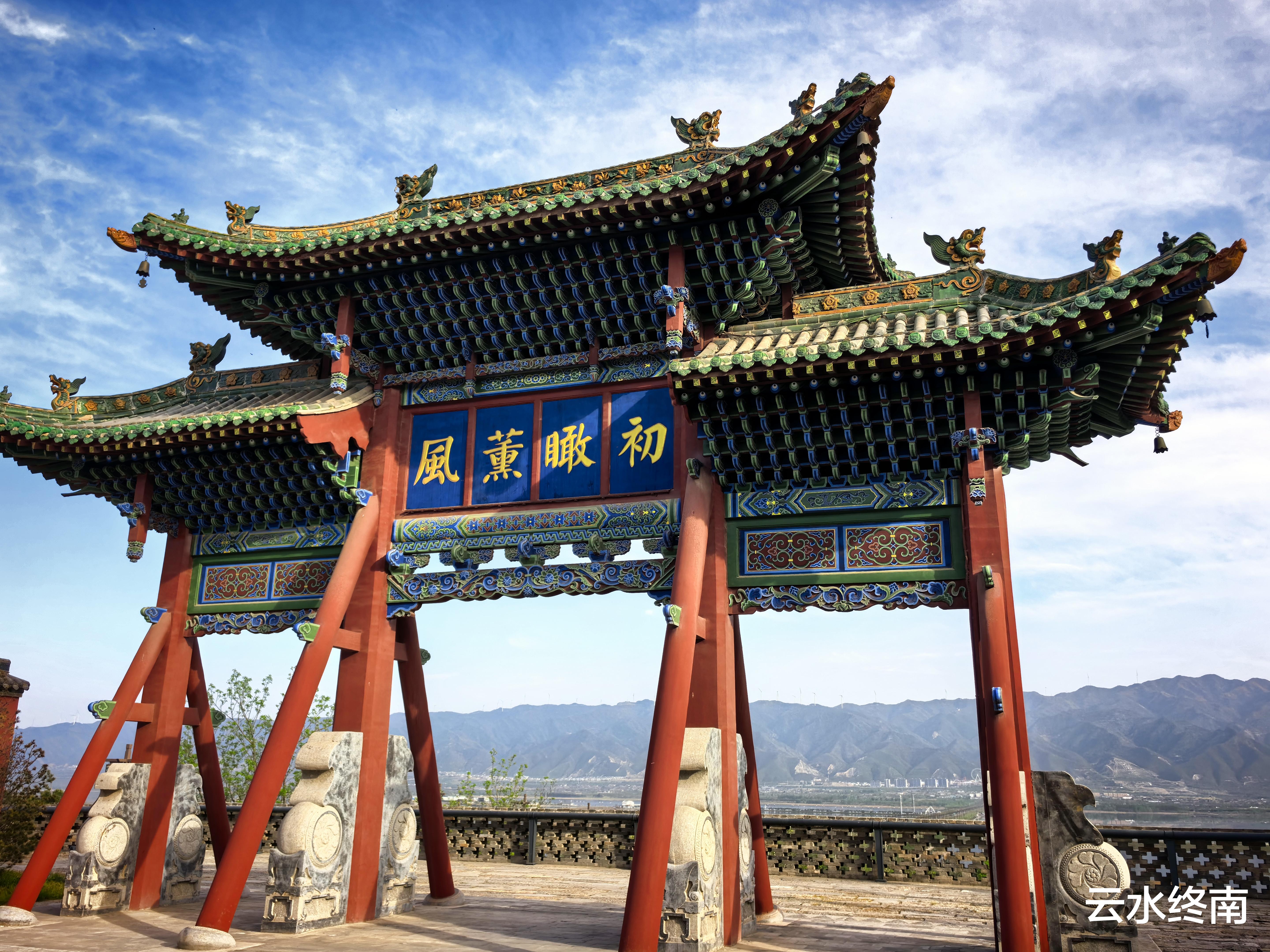 往北拾级而上,就是一个写着“地宝天成”的大牌楼,喘着气上了台阶,望歌薰楼看,确是山河壮阔。