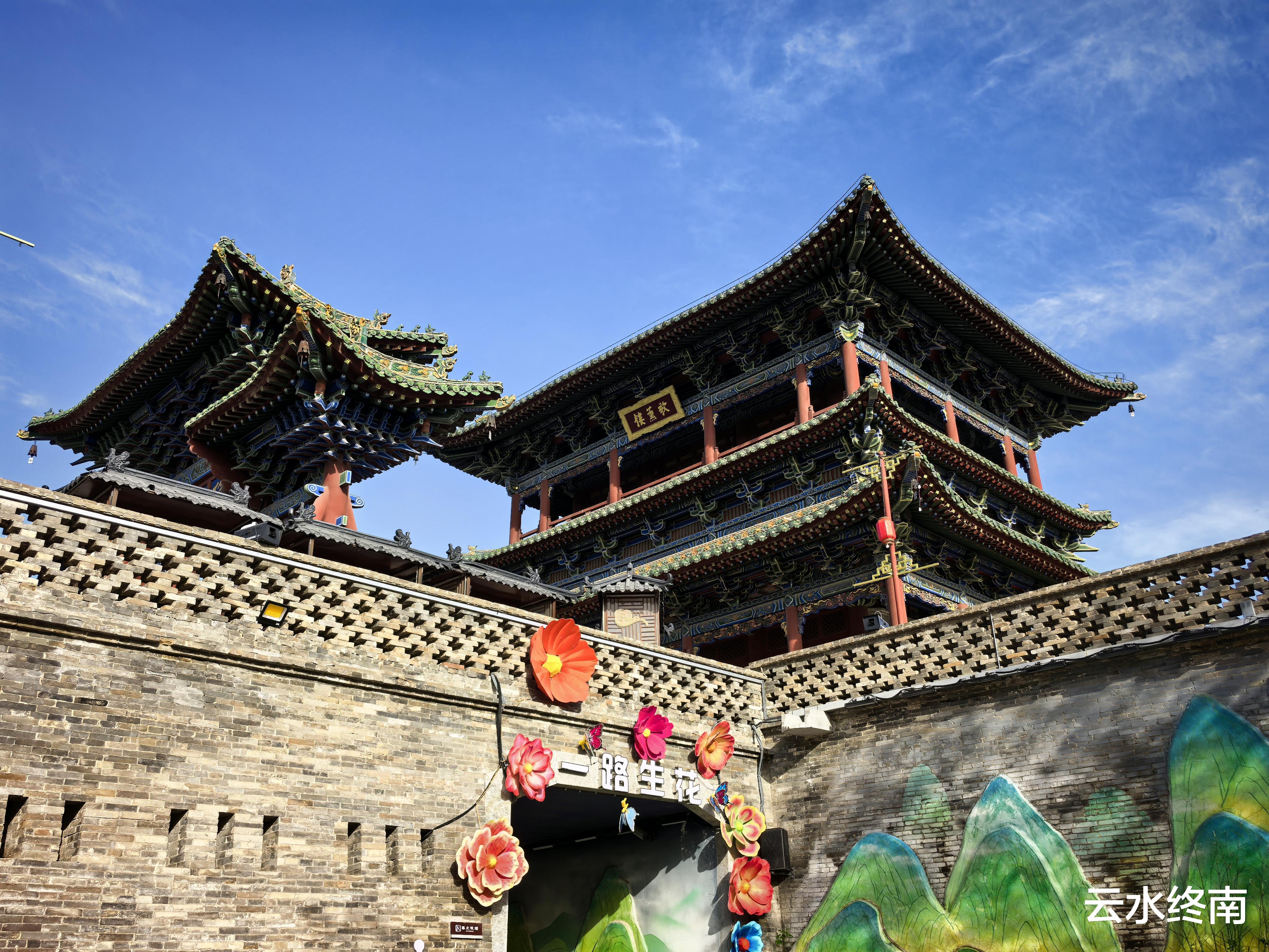 上面平台,就是大名鼎鼎的海光楼。海光楼创建于明 , 是盐池神庙的山门楼阁。现在这个也是在原址上复建。面阔五间,进深三间,高二层,重檐歇山顶。