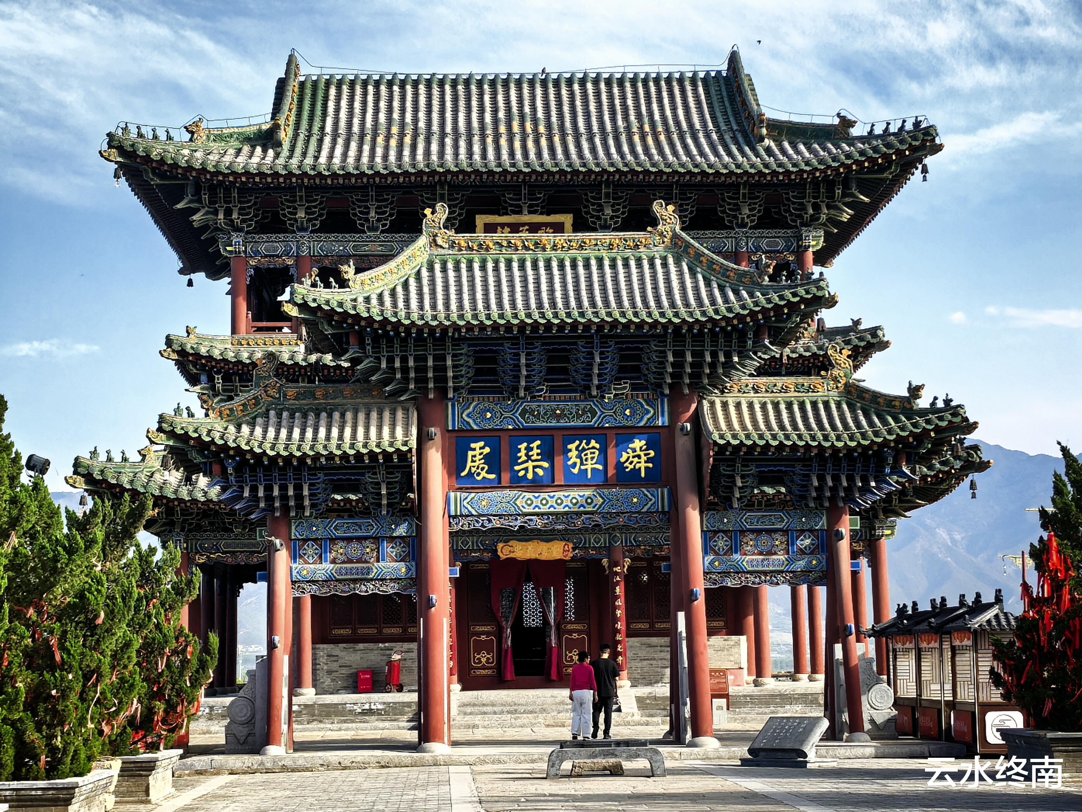 上面是个大平台,南面是歌薰楼,前面牌坊上有字“舜弹琴处”。这是有典故的,当年舜帝歌“薰风”就是在这个地方,一唱就是几千年。