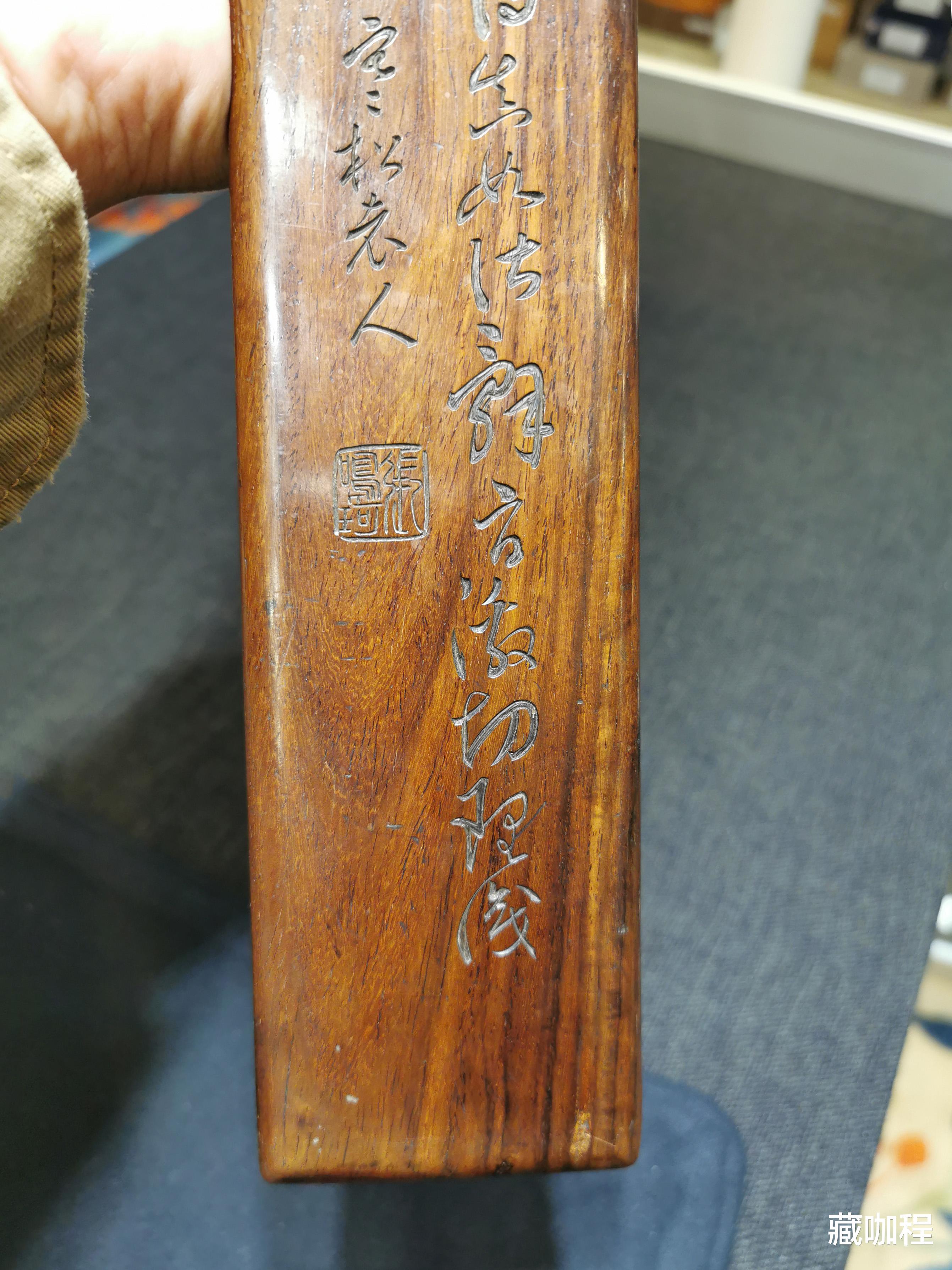 一根黄花梨镇尺,长59.8厘米,刻诗文题款,断代为清晚期,估价8至12万元。