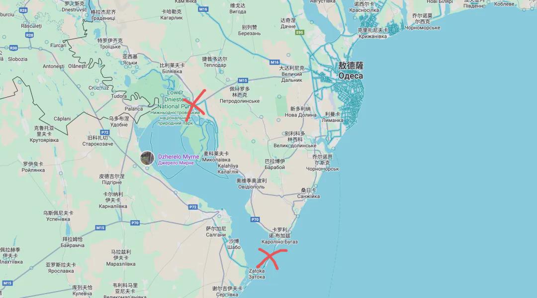 以上这2座桥(红叉处)是位于敖德萨南部,通往罗马尼亚的重要桥梁,有说法表示,由于以上桥梁的受损,导致了敖德萨州约60%的燃油运输受到了影响,而燃油是紧急发电的必需品。