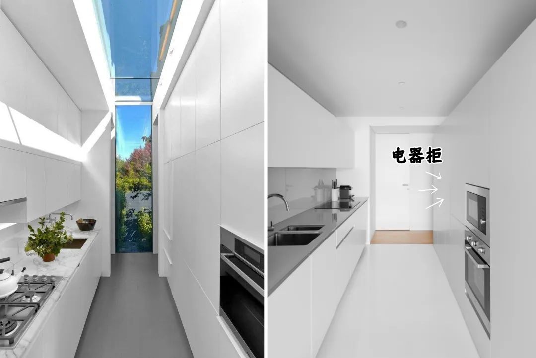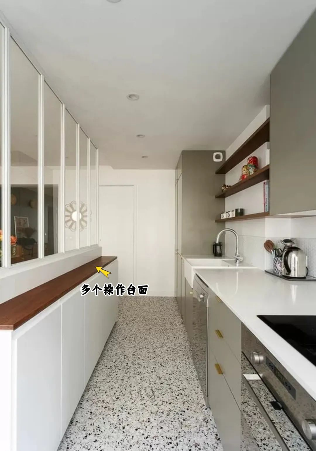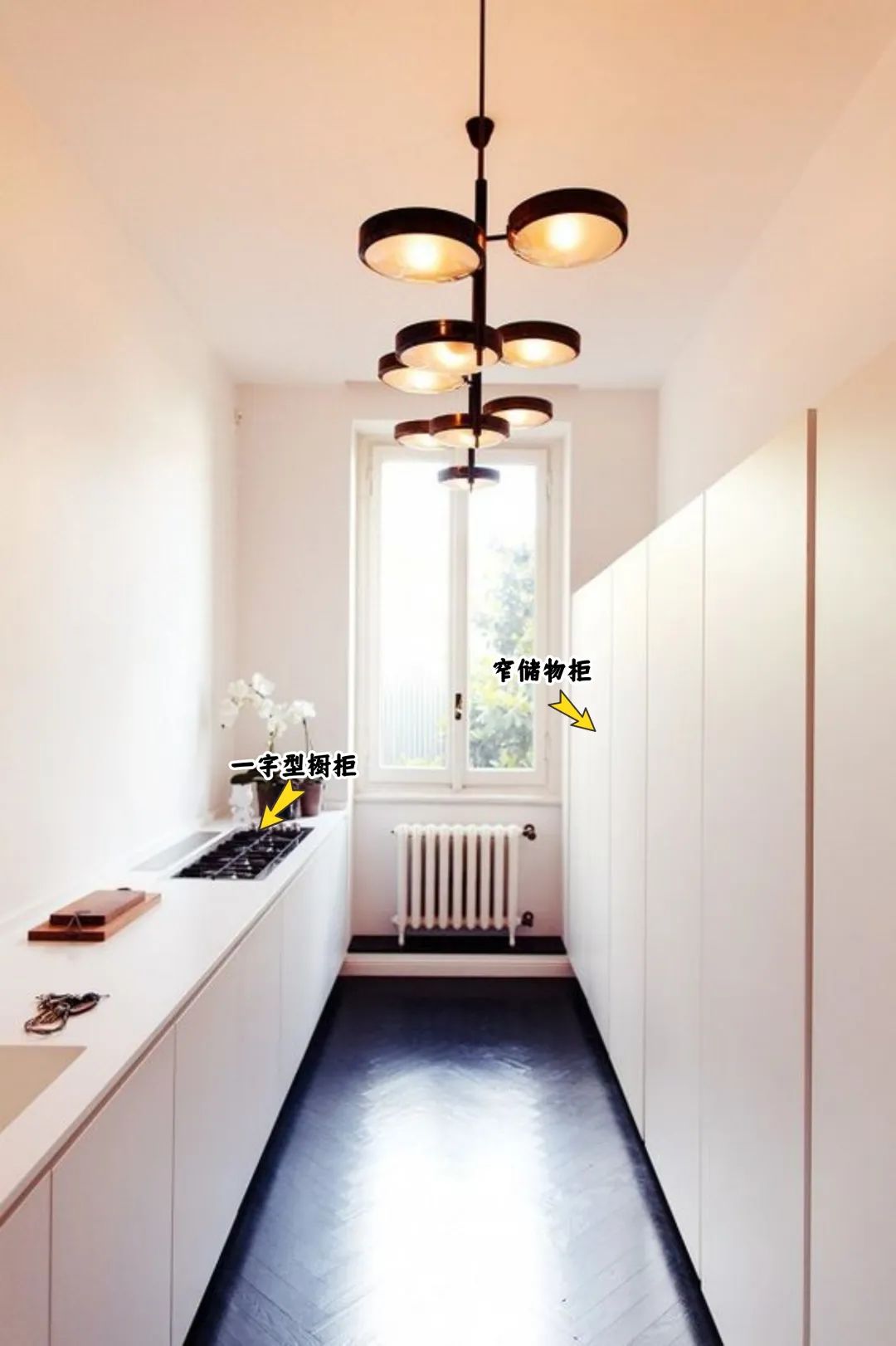 厨房又长又窄,直接灶台对面装排窄柜,能多出3个优势,还不占地
