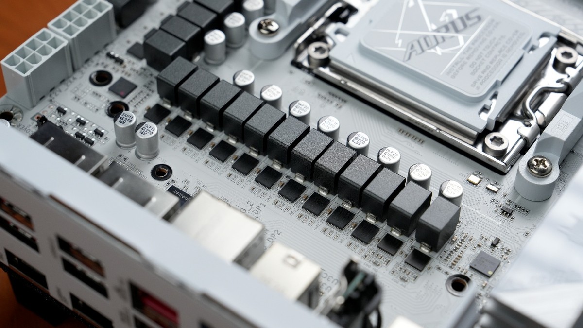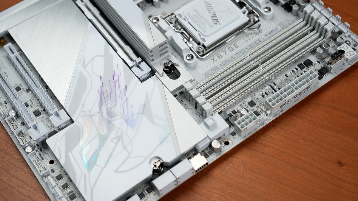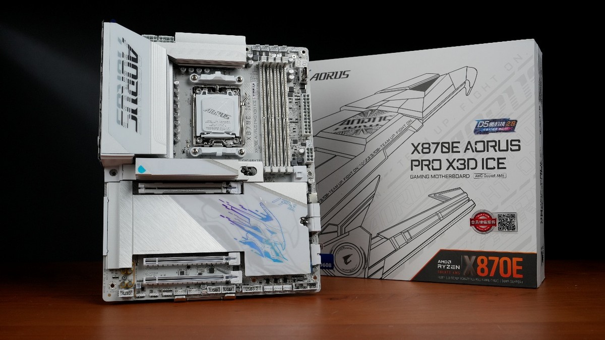 作为测试平台的基础,主板的冗余必须做足,X870E芯片组必须是首选。在同类主板中,技嘉X3D系列主板尤其值得一提——作为专为X3D系列处理器优化的主板,我们测试平台主板就选择了技嘉X870E AORUS PRO X3D ICE(下称X870E X3D电竞冰雕)。在供电上,这款纯白主板采用散热装甲全覆盖与金属背板加固,以及18+2+2相供电设计,其中18相CPU供电+2相显卡供电均支持110A电流,2相辅助供电支持60A。如此豪华的供电配置,哪怕是面对AMD Ryzen 9 9950X3D这样的旗舰也轻轻松松,游刃有余。