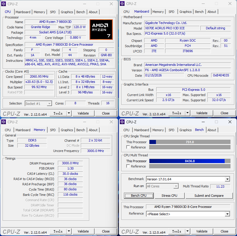 在标准模式下,9850X3D在CPU-Z单核跑出了815.3分,多核成绩8830.1分;9800X3D紧随其后,也取得了单核751分,多核8436.8分的成绩。9850X3D的单核性能提升了8.56%,多核性能提升4.66%。