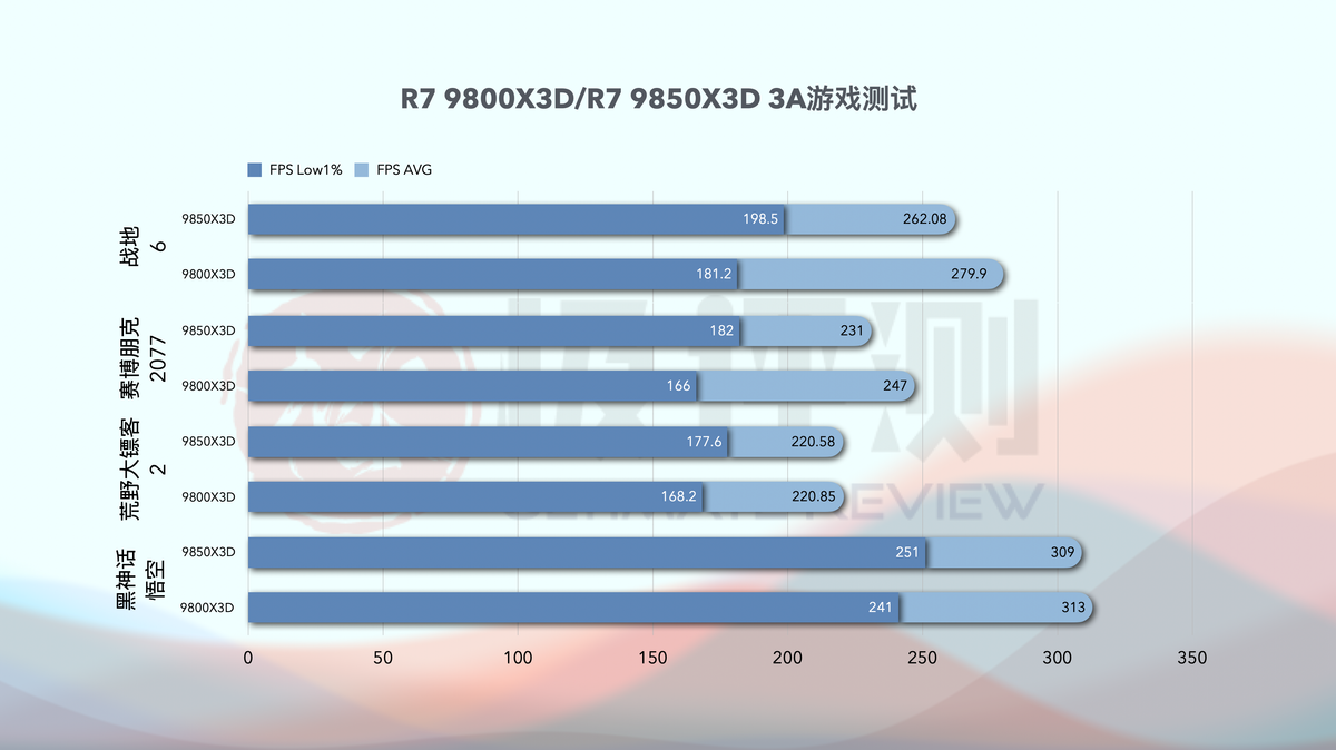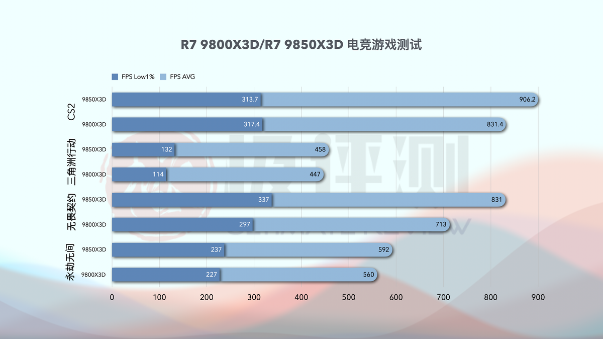 总结一下,在基准测试中,得益于更高的单核频率,9850X3D性能全面高出9800X3D。但是毕竟两款CPU的账面数据相差不大,整体提升并没有期望的那么明显,平均提升差不多在5%的样子,作为“按摩店特挑版”,9850X3D,更像是一种稳步的升级。当然基准测试并不是以点概面,代表全部性能,AMD 9000s X3D系列CPU的真正战场还是在游戏上,接下来的测试才是重头戏!