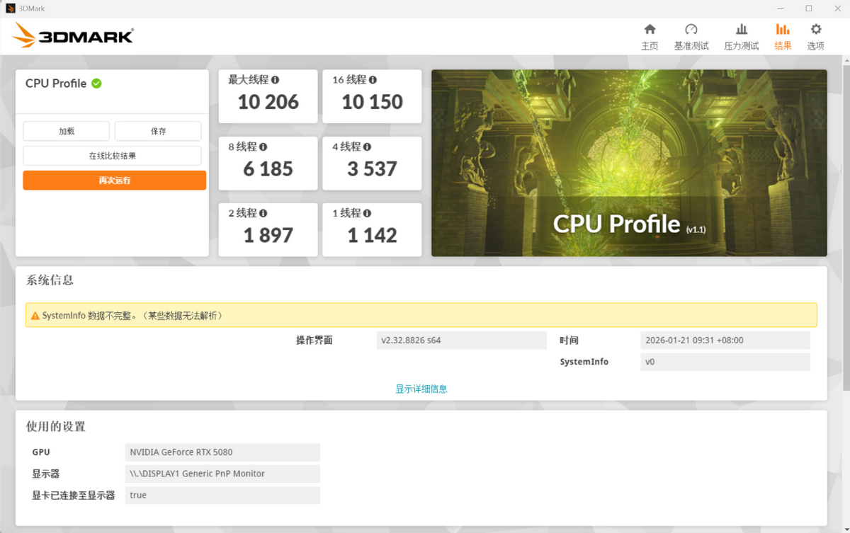 在3DMARK的跑分中,由于没有更新9850X3D的识别信息,所以系统信息显示并不完整,不过这并没有影响成绩,单线程得分为1236分,多线程为10547分。随后的9800X3D,单线程跑出了1142分,多线程10206分。9850X3D单线程提升性能约为8.23%,多线程性能提升约为3.34%。