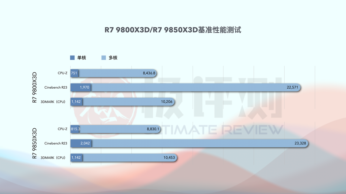 Cinebench R23中,9850X3D在标准模式下单核2123分、多核23328分的成绩;9800X3D取得了单核1970分,多核22571分。9850X3D单核性能提升7.76%,多核性能提升3.35%。