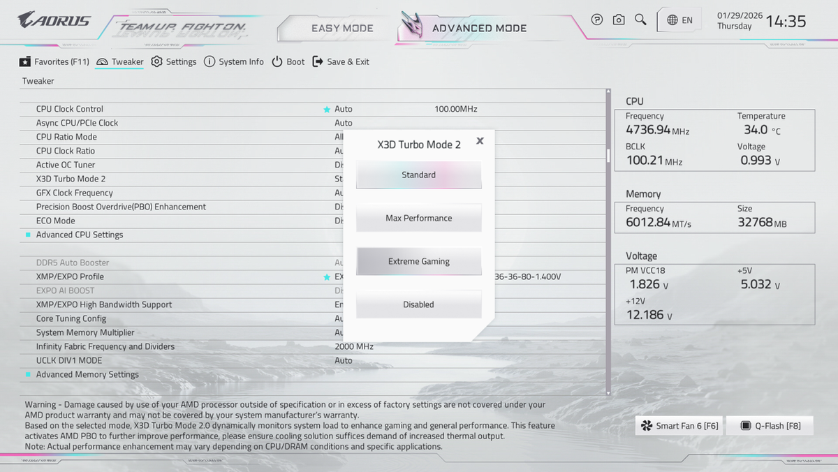前面我们对9850X3D在标准模式下的进行了基准测试,紧接着就是各位期待的榨干性能测试和与“前浪”9800X3D的对比。为此,我在X870E X3D电竞冰雕BIOS中,开启了“X3D鸡血模式2.0”,并设定为极限游戏(Extreme Gaming),再次进行对比测试。