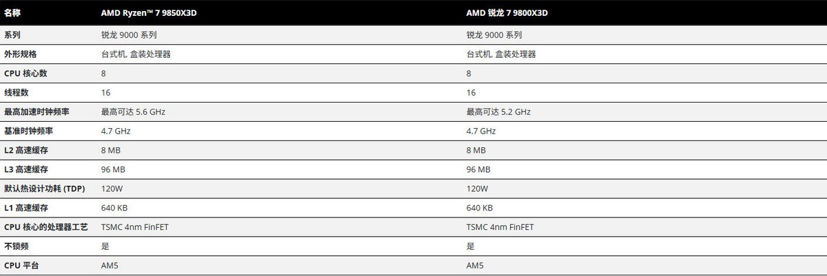处理器:AMD Ryzen 7 9850 X3D/AMD Ryzen 7 9800 X3D