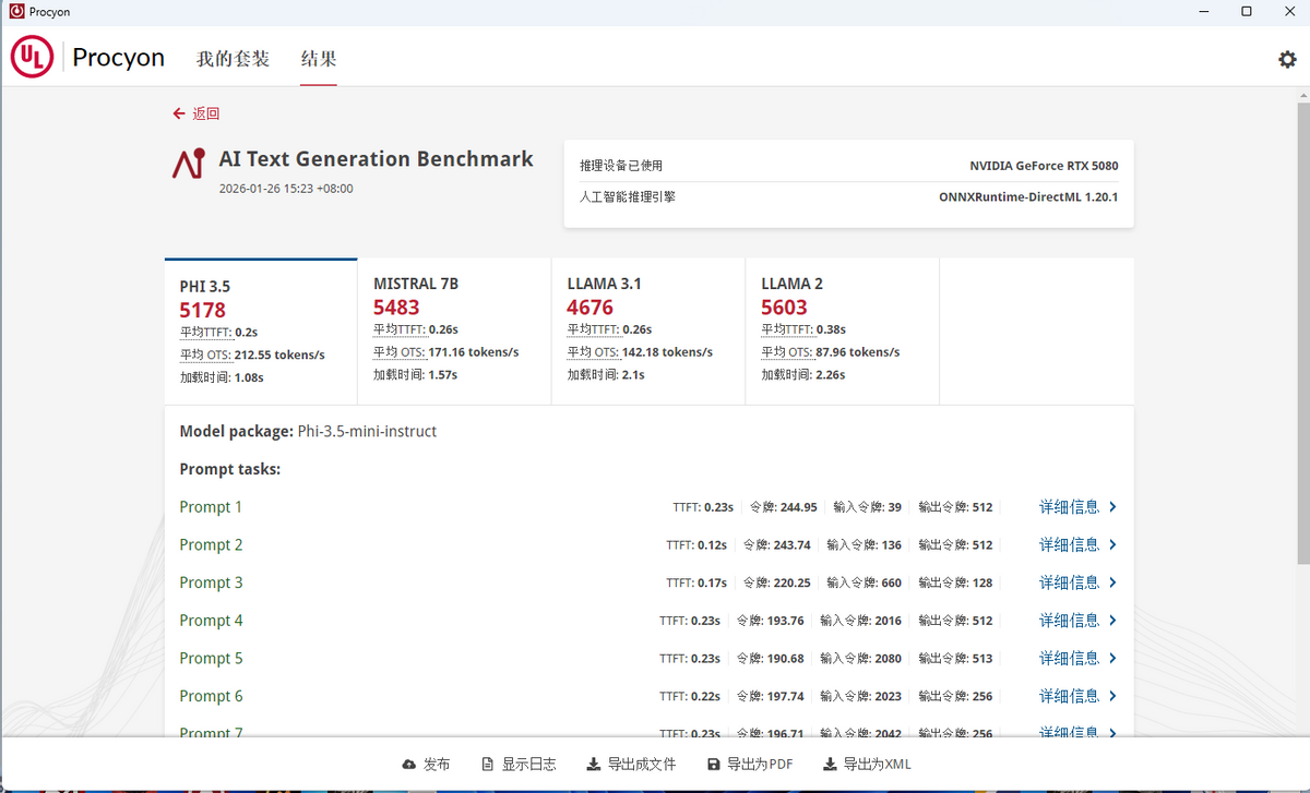 得益测试平台上的RTX 5080雪鹰算力叠加,9850X3D在Procyon AI Text Generation测试中也有不错的表现,其PHI 3.5模型得分5178,MISTRAL 7B模型得分5483,LLAMA 3.1模型得分4676,LLAMA 2模型得分5603。