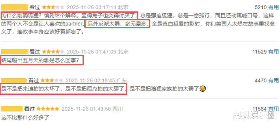 大部分差评,在于剧本太过简单,狐狸尼克“戏份”被削弱,还有兔子朱迪以及反派猞猁家族“降智”。