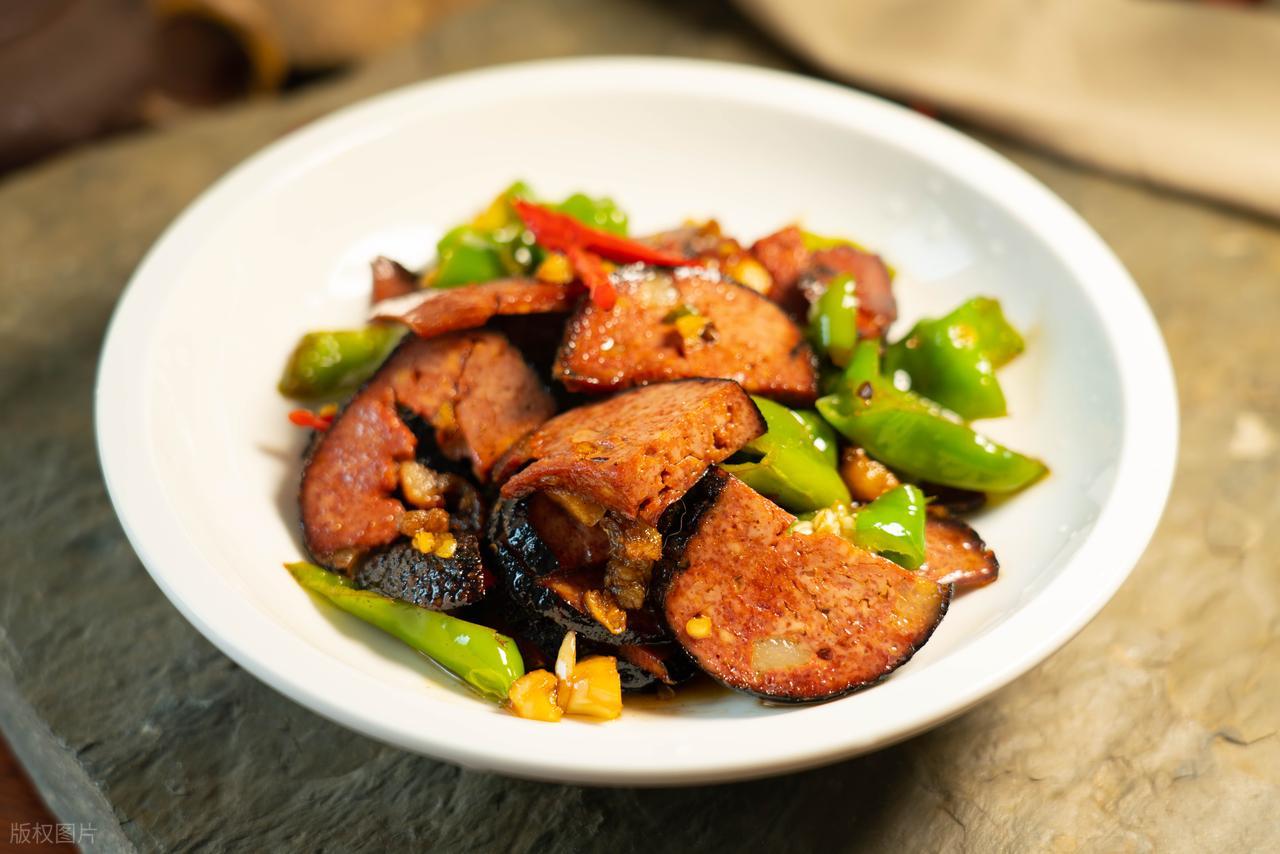 猪血丸子切片后与青蒜、小米椒同炒,腊香可口,咸香爽辣。