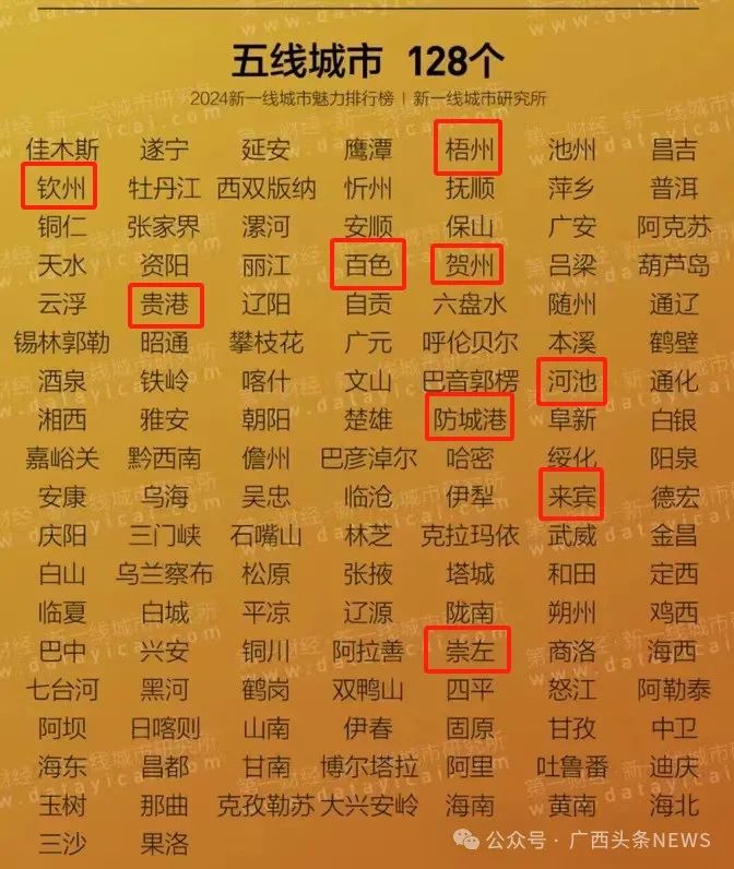 2024年《城市商业魅力排行榜》。 来源:第一财经02广西各城市排名如何?榜单显示,广西14个城市当中,有1个二线城市,2个三线城市,2个四线城市,9个五线城市。其中,南宁是广西14个城市当中唯一一个二线城市;桂林、柳州位列三线城市;北海、玉林位列四线城市;百色、梧州、贵港、钦州、河池、贺州、来宾、防城港、崇左位列五线城市。南宁市作为广西的首府城市,未来的发展目标是成为北部湾城市群核心城市、面向东盟开放合作的区域性国际大都市,以及“一带一路”有机衔接的重要门户枢纽城市。