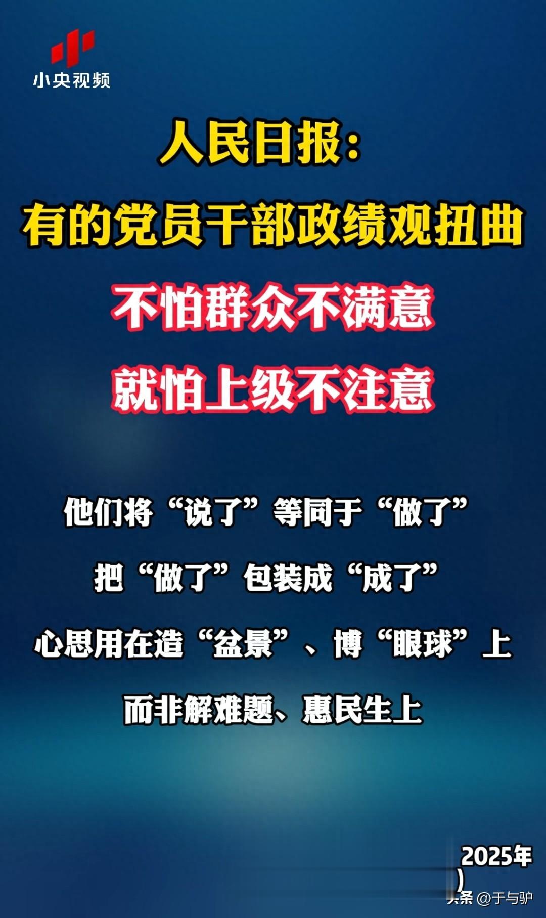 9月22日人民日报社评,有的党员干部政绩观扭曲,不怕群众不满意,就怕上级不注意。他们将“说了”等同于“做了”,把做了包装成“成了”,心思用在“造盆景”、博“眼球”,而非解难题,惠民生上。