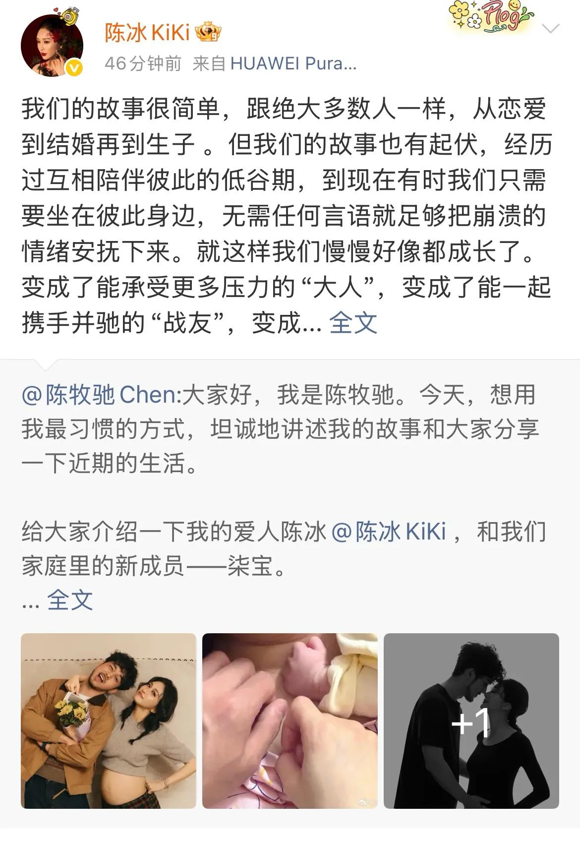 随后,陈冰也是转发了这条官宣的内容并深情回应:我们的故事很简单,跟绝大多数人一样,从恋爱到结婚再到生子 。在经历了低谷之后,成长了很多,变成了能承受更多压力的“大人”,变成了能一起携手并驰的“战友”,变成了能分享所有秘密的“闺蜜”,变成了需要一起养育稚子的“父母”。现在 我们的身份又升级啦~从二人世界变为了三口之家~这个世界上又多了一个可以拿捏我的男人 哈哈~柒宝,爸爸妈妈永远爱你。